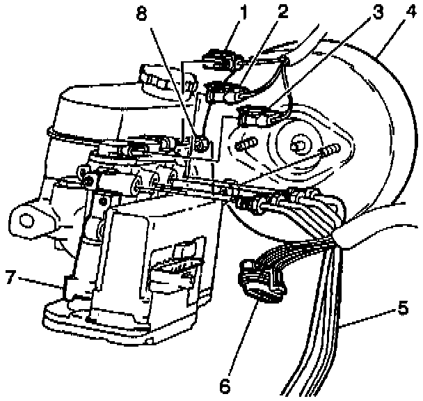 6. Remove the two nuts (8) attaching the ABS brake modulator/master cylinder assembly (7) to the vacuum booster.