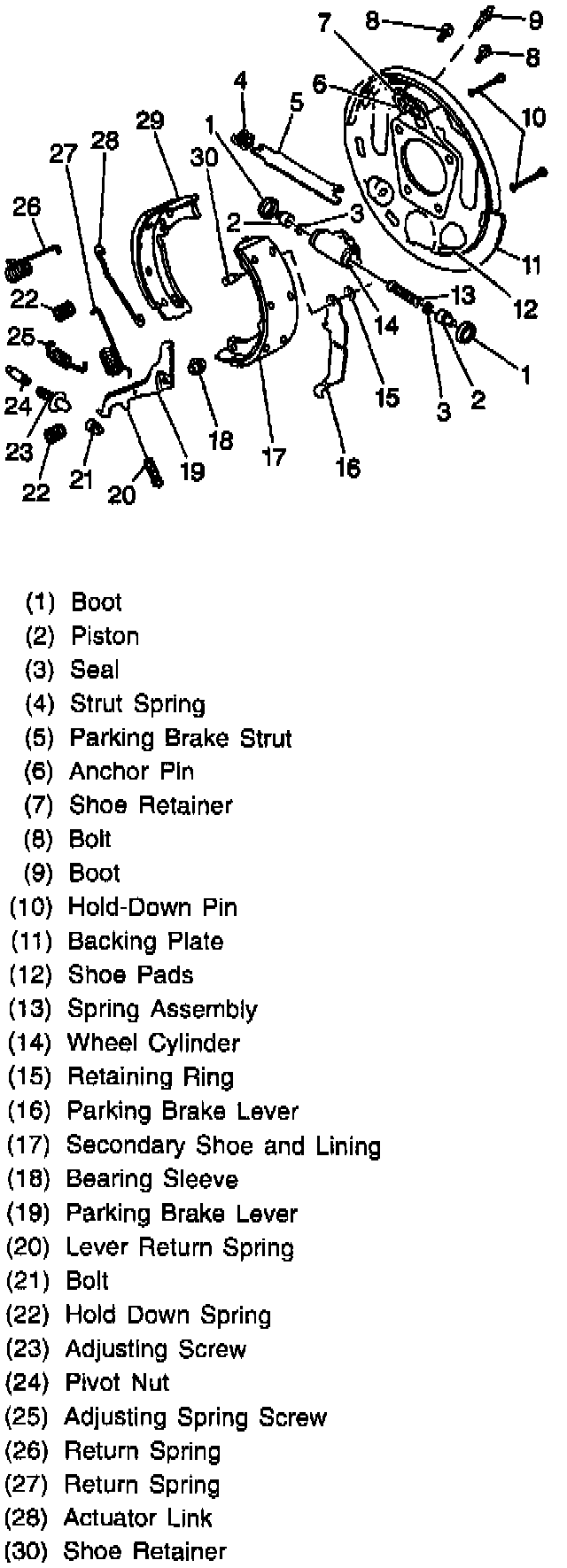 The drum brake assembly is a duo-servo design. In the duo-servo brake, the force which the wheel cylinder applies to the primary shoe is multiplied by the primary lining friction in order to provide a very large force applied to the secondary shoe. The brake shoes transfer torque to the anchor pin, through the backing plate and to the axle flange. Adjustment for both the primary and the secondary shoe and linings is automatic during the reverse brake applications.