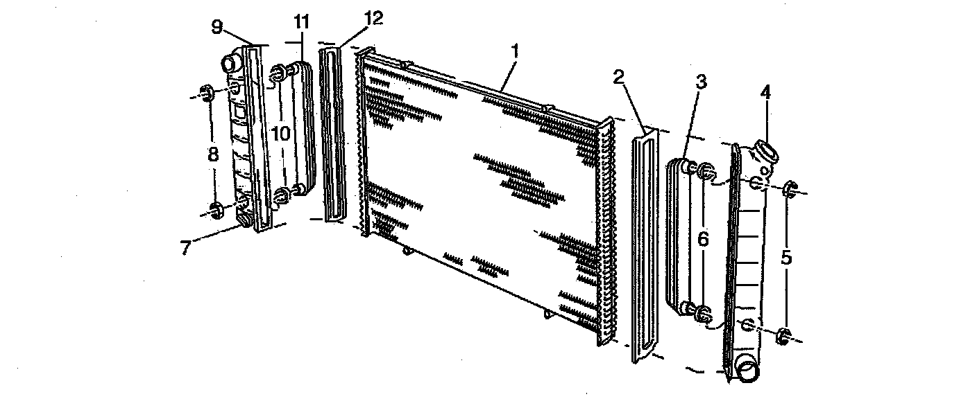 Clinch tabs fasten the end tanks to the core. A high temperature rubber gasket (2) seals each of the end tanks. The right side end tank houses the transmission oil cooler. The left side end tank houses the engine oil cooler. Rubber gaskets (6) and nuts (5) seal the oil cooler fittings to the end tanks. The drain cock is plastic and this is at the bottom of the left side end tank.