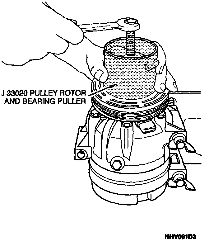 4. Hold the J 33020 puller in place and tighten the puller screw against the puller guide to remove the pulley rotor and bearing assembly.