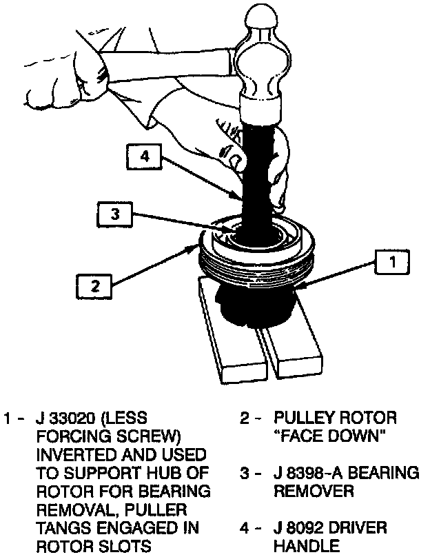 5. To prevent damage to the pulley rotor during bearing removal the rotor hub must be properly supported.
