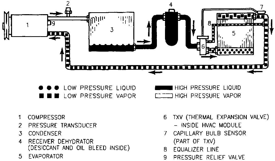 This A/C system uses both a thermal expansion valve (TXV) and a variable displacement 5 cylinder compressor (V-5). The TXV's only purpose is to regulate the amount of refrigerant flow through the evaporator to achieve optimum performance. Too much flow through the evaporator floods (the refrigerant stays liquid all of the way through the evaporator and boils in the compressor inlet hose), not enough flow and the evaporator starves (the refrigerant boils too early in the evaporator). Both conditions will cause A/C performance to be less than optimal. The goal is to get the refrigerant to boil around the middle of the evaporator The TXV achieves this by sensing the evaporator outlet pressure and outlet temperature to control refrigerant flow to a predetermined factory setpoint. It should be noted that the TXV is a no bleed design (to prevent liquid slugging upon start up). This means that when the compressor is disengaged the TXV closes off completely and high & low-side pressures take a long time to equalize (they will eventually equalize due to a very small amount of bleed back through the compressor reeds). It should also be noted that a good TXV on the bench (removed from the system) will be wide open due to atmospheric pressure and temperature acting upon it.