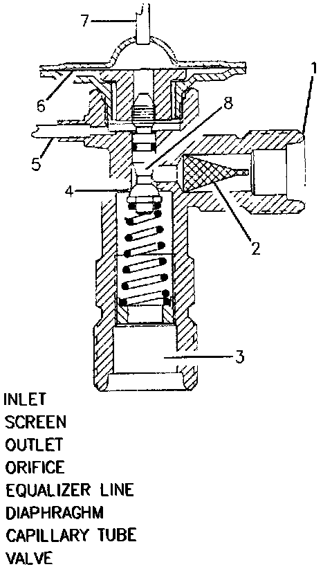 The Thermal Expansion Valve (TXV), with its monitoring bulb and attaching capillary, mesh screen, and variable orifice is located in the evaporator inlet pipe. While sensing the temperature of the evaporator outlet pipe, the monitoring bulb's internal pressure raises or lowers in direct proportion. (By sensing a higher temperature, the TXV opens further to allow more R-134a into the evaporator, and the opposite when it senses cooler temperatures). This provides a variable restriction for the high-pressure liquid refrigerant in the liquid line, which meters the flow of refrigerant to the evaporator as a low-pressure liquid. The thermal expansion valve is protected from contamination by a filter screen.