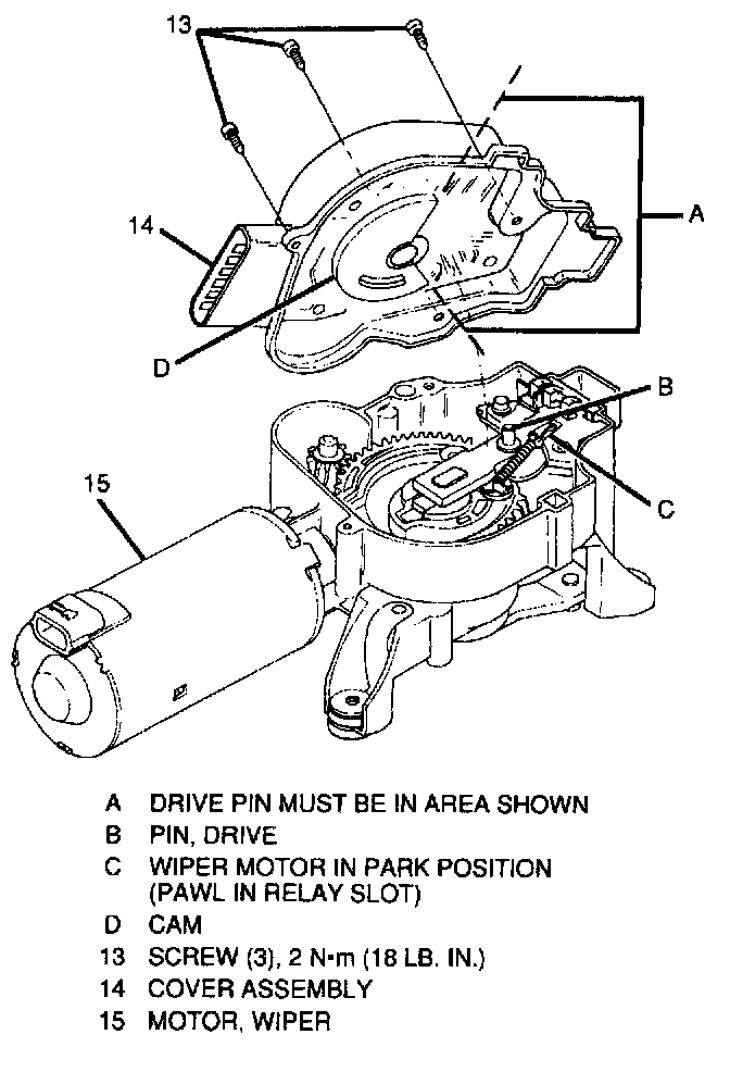 3. Wiper motor cover assembly (14). Follow "Wiper Motor Cover Assembly Replacement" procedure carefully.