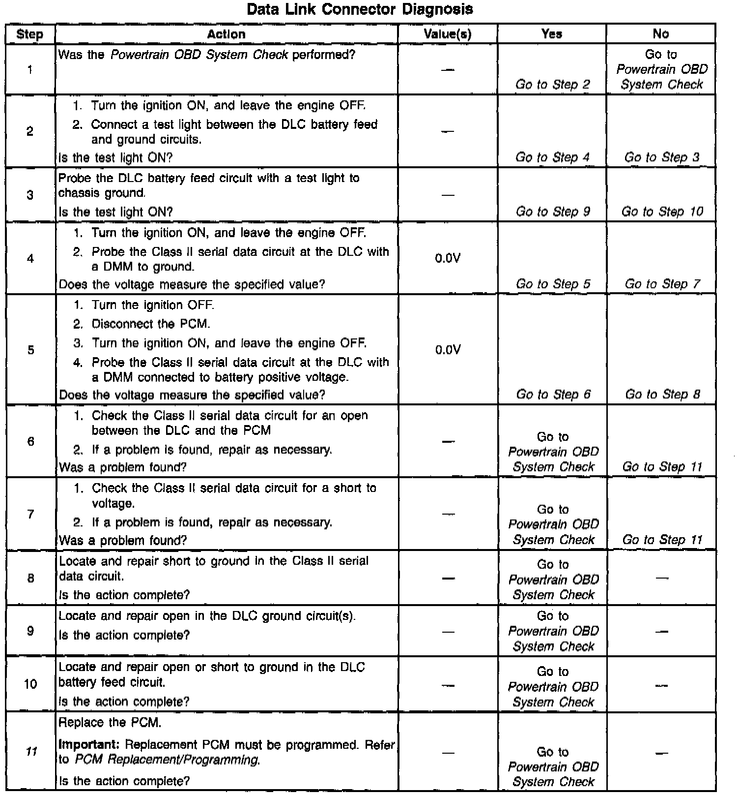 The Class II serial data circuit to the Data Link Connector (DLC) allows bi-directional communication between the PCM and the scan tool. If communication between the scan tool and the PCM cannot be established, the procedure in Data Link Connector Diagnosis should be used to diagnose the condition.