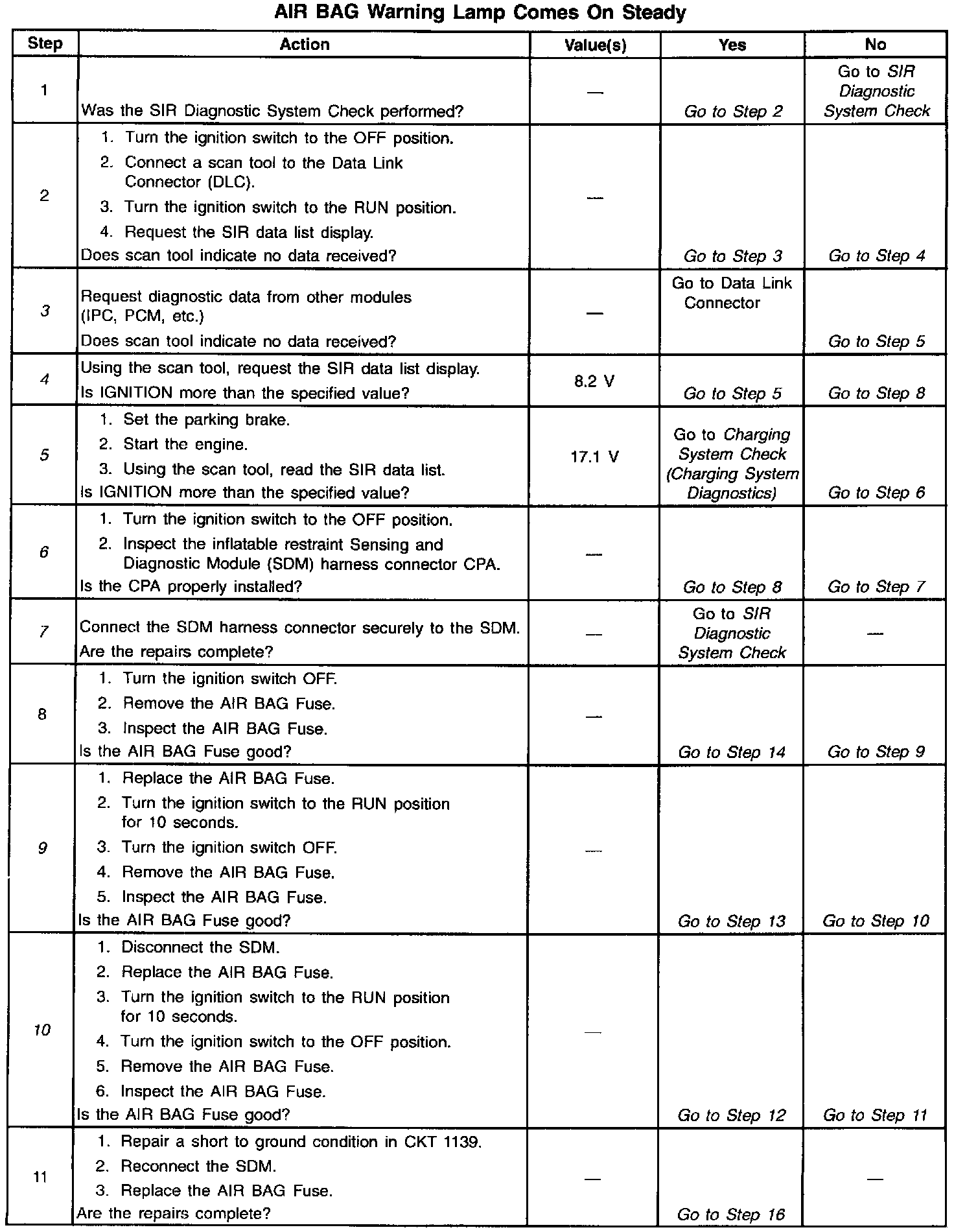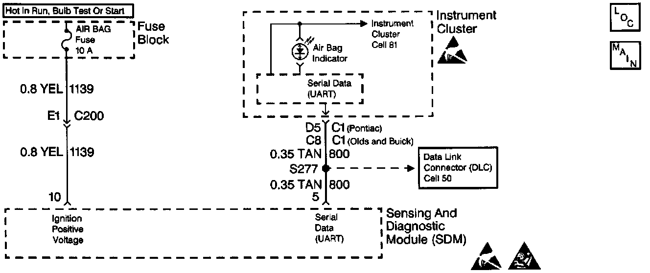 When the ignition switch is first turned to OFF/UNLOCK or RUN, IGNITION 1 voltage is applied from the CLS/PCM fuse to the INDICATORS bus in the Instrument Panel Cluster (IPC). The ground side of the AIR BAG indicator (LED) is controlled by the instrument cluster microprocessor. When the ignition switch is in the OFF/UNLOCK position, the serial data line (CKT 800) is not operative. This condition will cause the IPC microprocessor to turn the AIR BAG (as well as the SEAT BELT) indicator ON steady. When the ignition switch is first turned to RUN, the AIR BAG Fuse applies battery voltage to the IGNITION 1 input, terminal 10. The inflatable restraint sensing and diagnostic module (SDM) responds by flashing the AIR BAG indicator (via the serial data line) seven times. If IGNITION 1 is outside of the normal operating voltage range (8.2.-17.1 volts), the AIR BAG indicator will come ON steady with no DTCs set.
