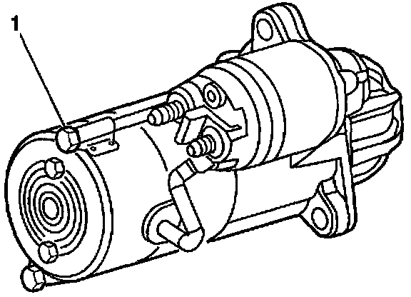 35. If equipped, remove the 10 mm hex head nut from the ground stud on the engine block. If no ground stud is present, remove one of the long bolts (1) that attach the starter motor end cap to the starter housing.