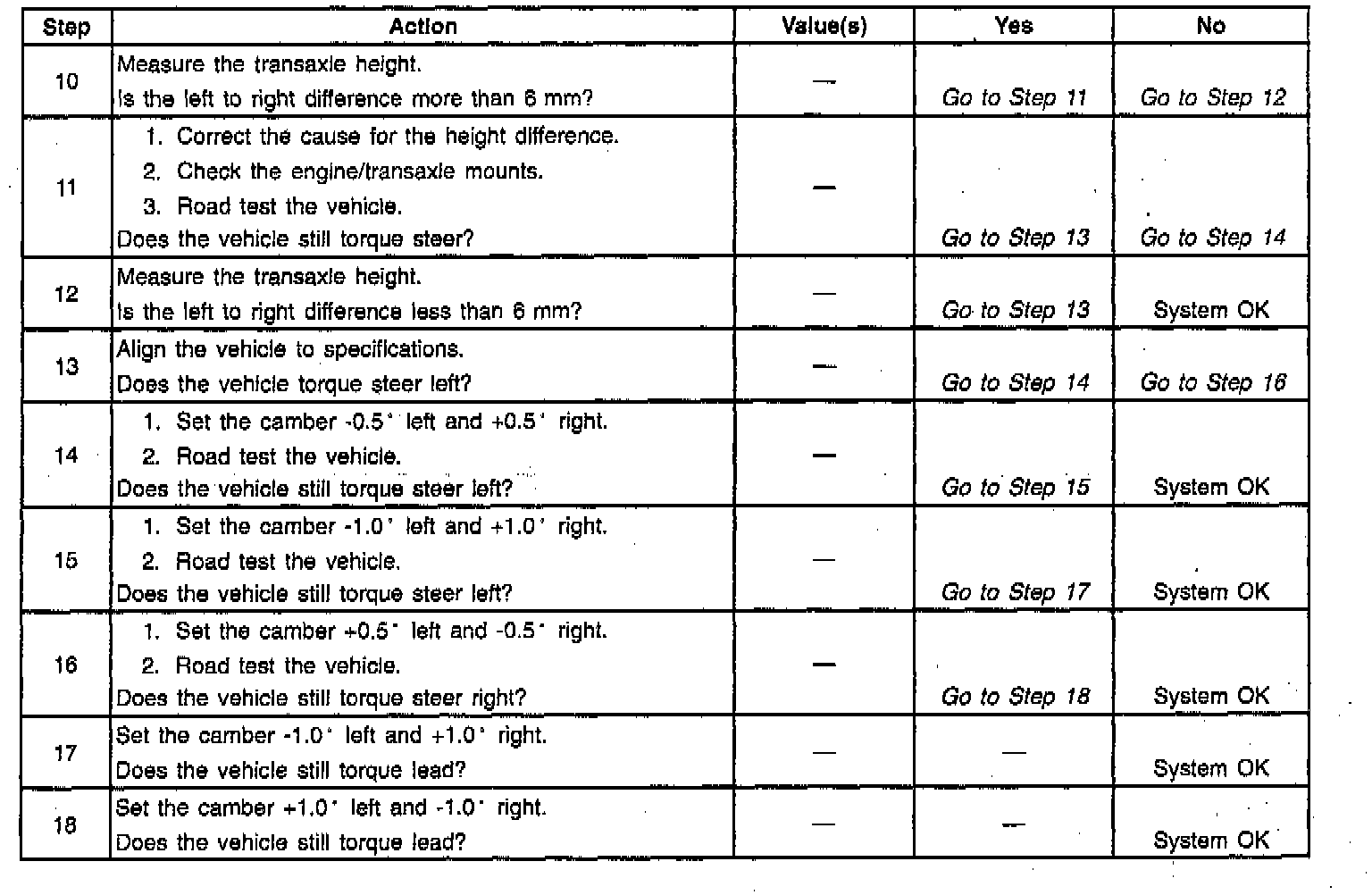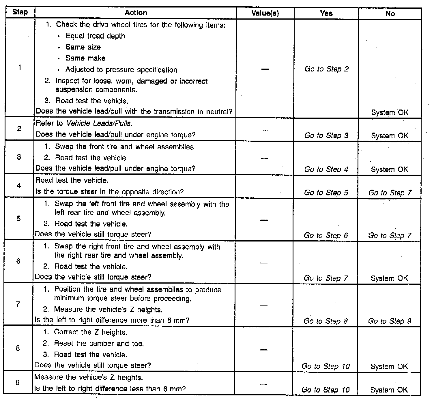 If the tire pressures are correct, move the front tire and wheel assemblies to the rear, one side at a time, in order to determine which tire is causing the problem. Drive the vehicle after each switch in order to determine if the problem has been corrected. Replace the defective tire. For further diagnosis refer to the TORQUE STEER DIAGNOSIS table.