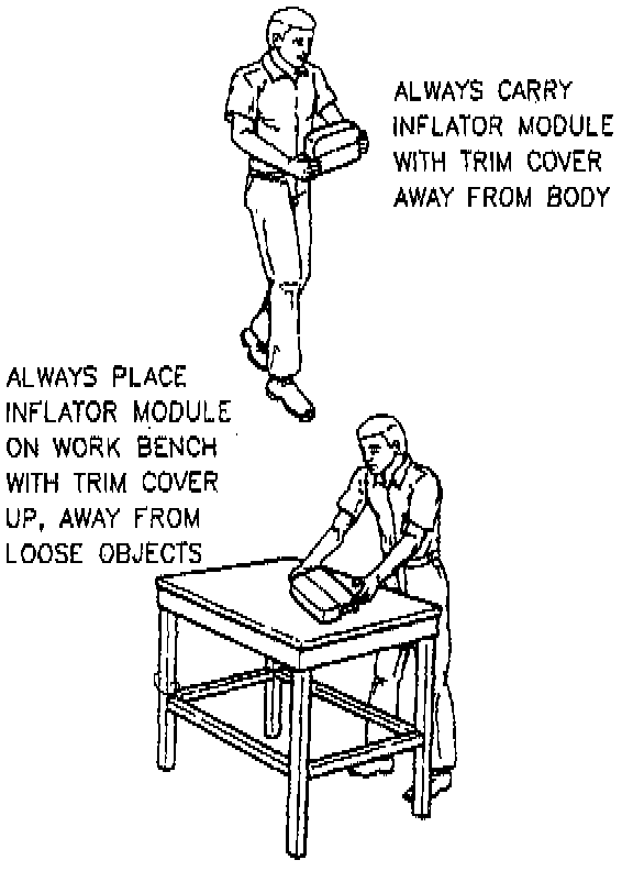 WARNING: When carrying a live inflator module, make sure the bag opening is pointed away from you. Never carry the inflator module by the wires or connector on the underside of the module. In case of an accidental deployment, the bag will then deploy with minimal chance of injury. When placing a live inflator module on bench or other surface, always face the bag and trim cover up, away from the surface. Never rest a steering column assembly on the steering wheel with the inflator module face down and column vertical. This is necessary so that a free space is provided to allow the air bag to expand in the unlikely event of accidental deployment. Otherwise, personal injury may result.