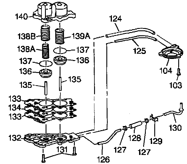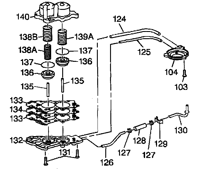 5. Disassemble the manual 2-1 band servo. Remove the forward band servo oil pipes (124, 125), and remove the lube oil pipe assembly (126) from both the accumulator cover (132) and from the manual 2-1 band servo cover (104).