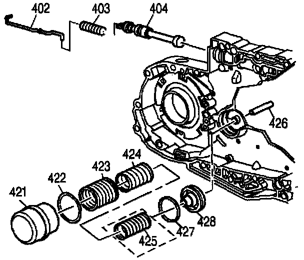 3. Remove the outer spring (423), middle spring (424), and inner spring (425) for the 3-4 accumulator piston.