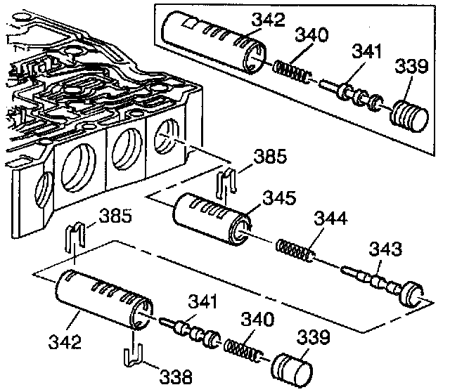 51. Remove the plug (339), the 1-2 accumulator valve (341), and the spring (340) from the bushing.