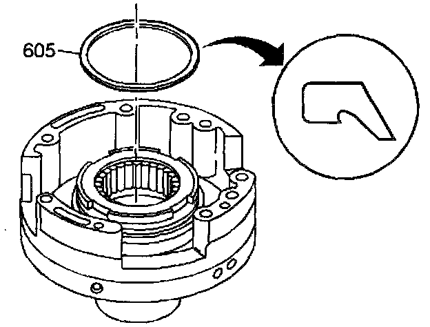 2. Use transmission fluid in order to lubricate a new inner seal (605) for the fourth clutch piston. Affix the seal to the driven sprocket support hub.