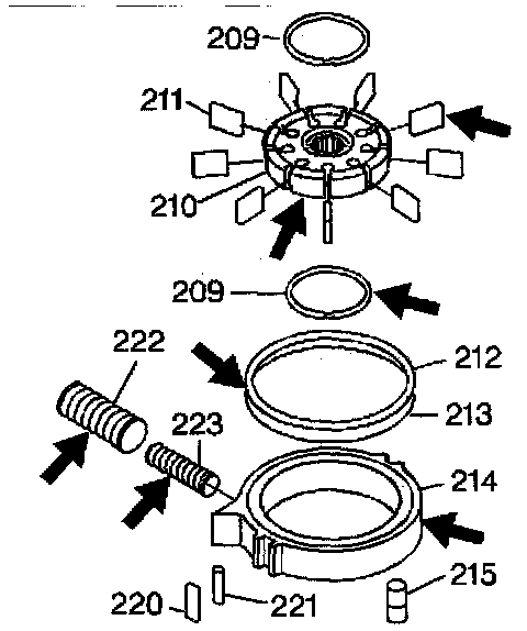 19. Assemble the pump vanes (211) into the rotor (210). The vanes must be flush with the top of the rotor.