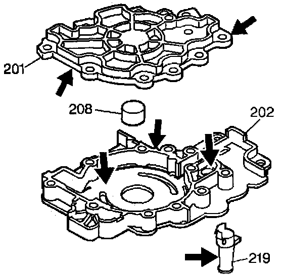 4. Inspect the oil pump cover (201) for cracks, wear, or gouges from the pump vanes.