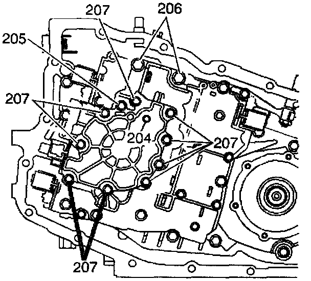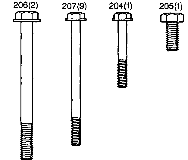23. Install the 13 oil pump bolts as indicated (204-207).