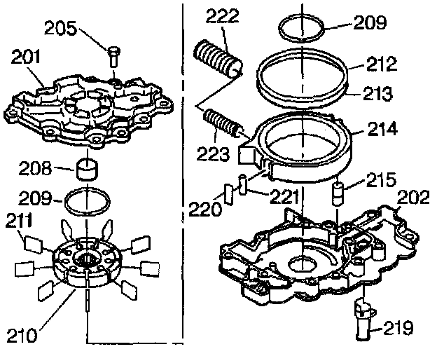 3. Remove the pump rotor (210), the vane rings (209) and the bushing (208).