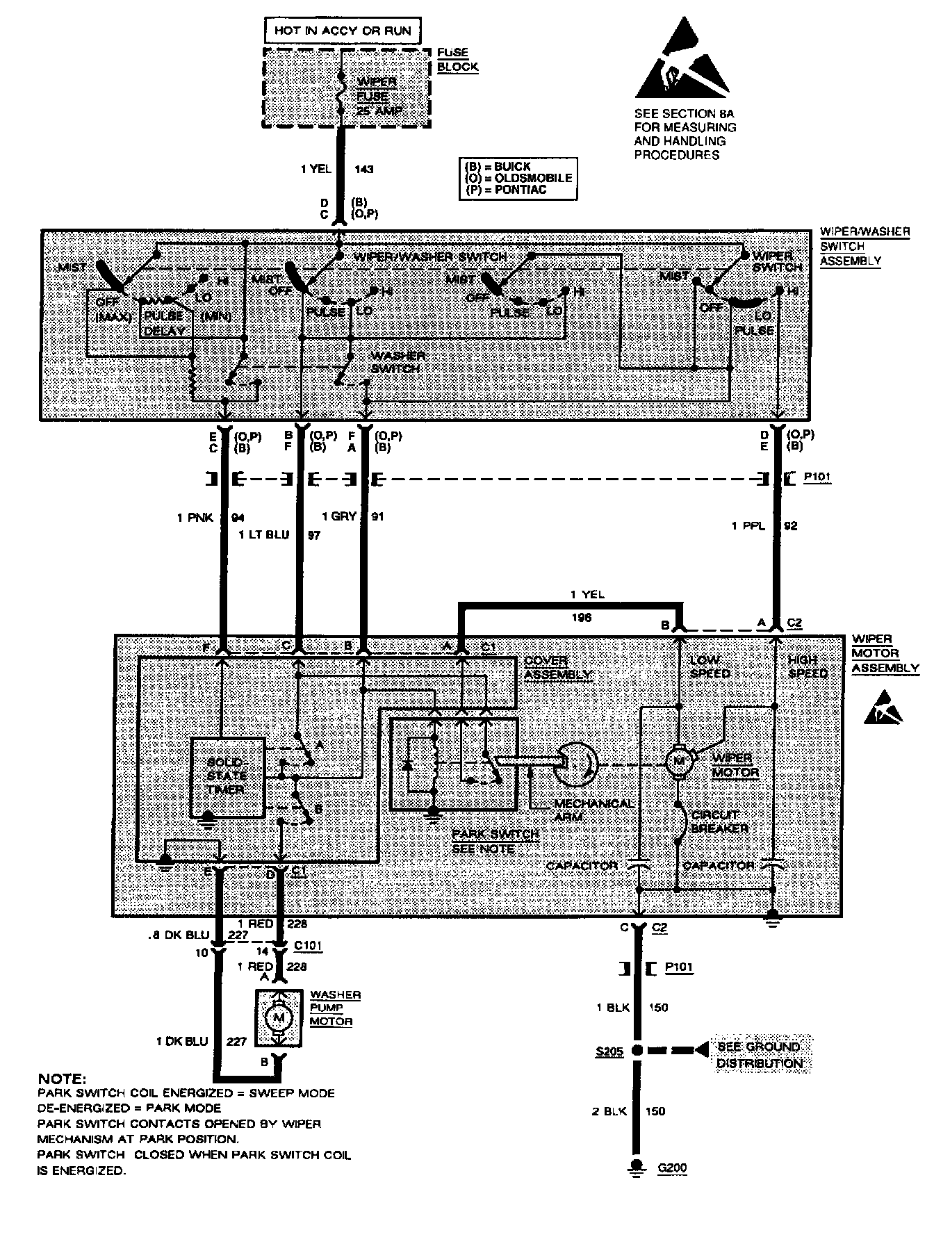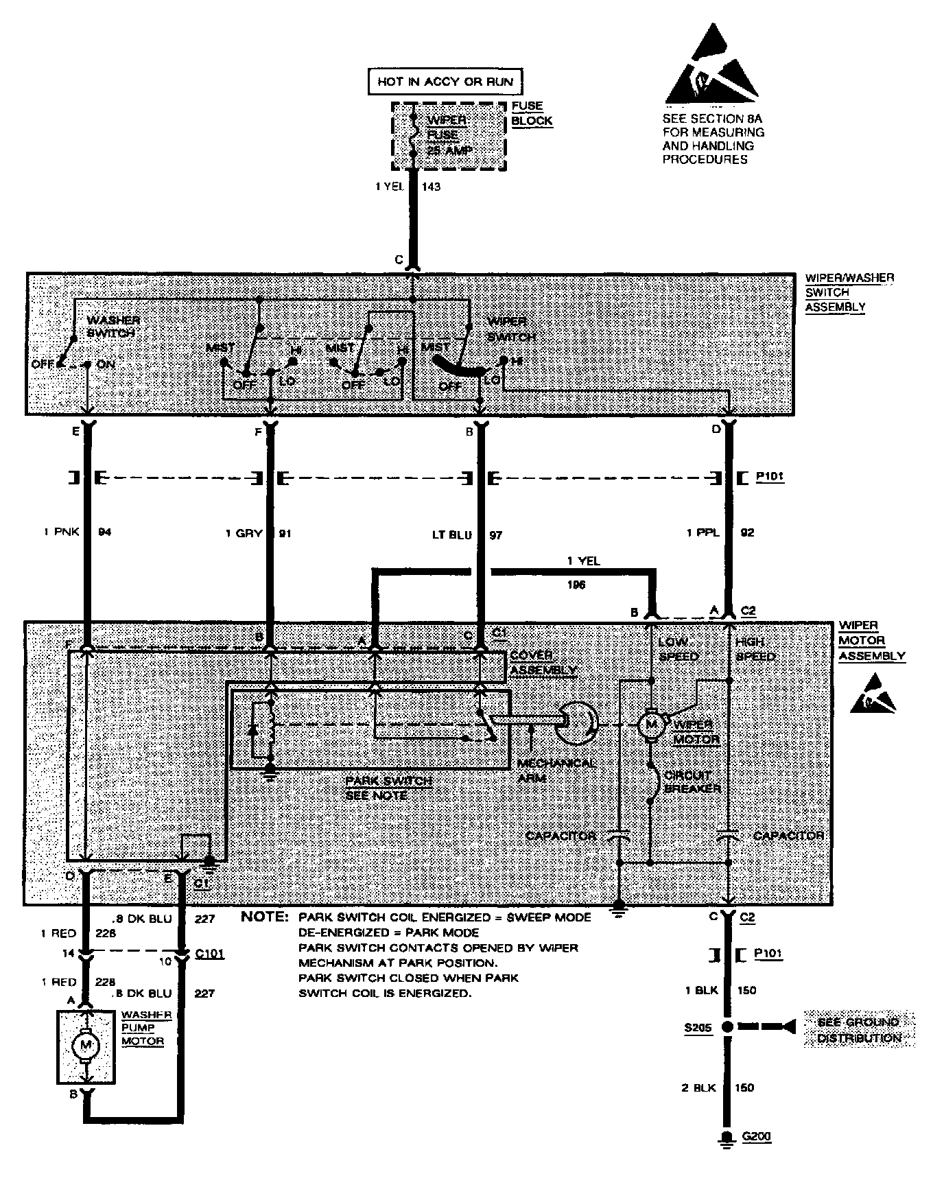 3. If wipers cycle in and out of park position in "HIGH" and do not operate in "LOW," "MIST," or "DELAY," check circuit 196 for an open.