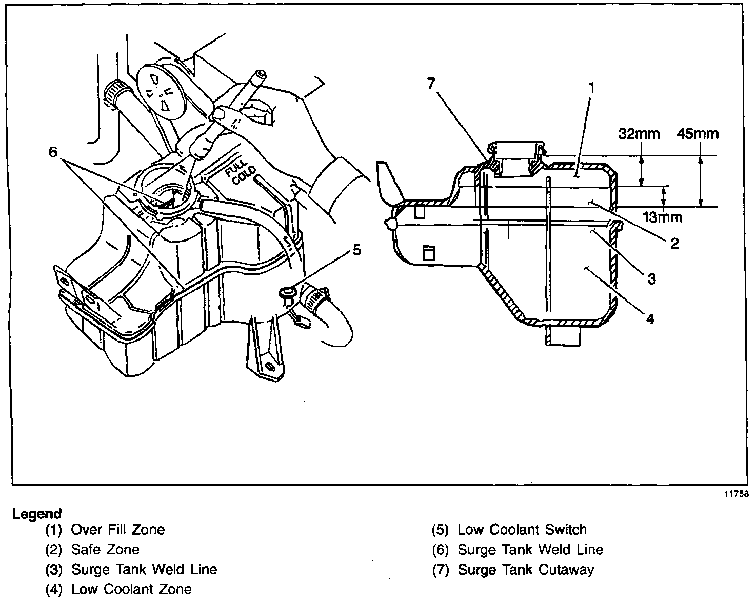 The tank is mounted at a point higher than all other coolant passages, thereby providing air bleed for the system. The coolant level in the radiator surge tank should be maintained at or slightly above the weld line.