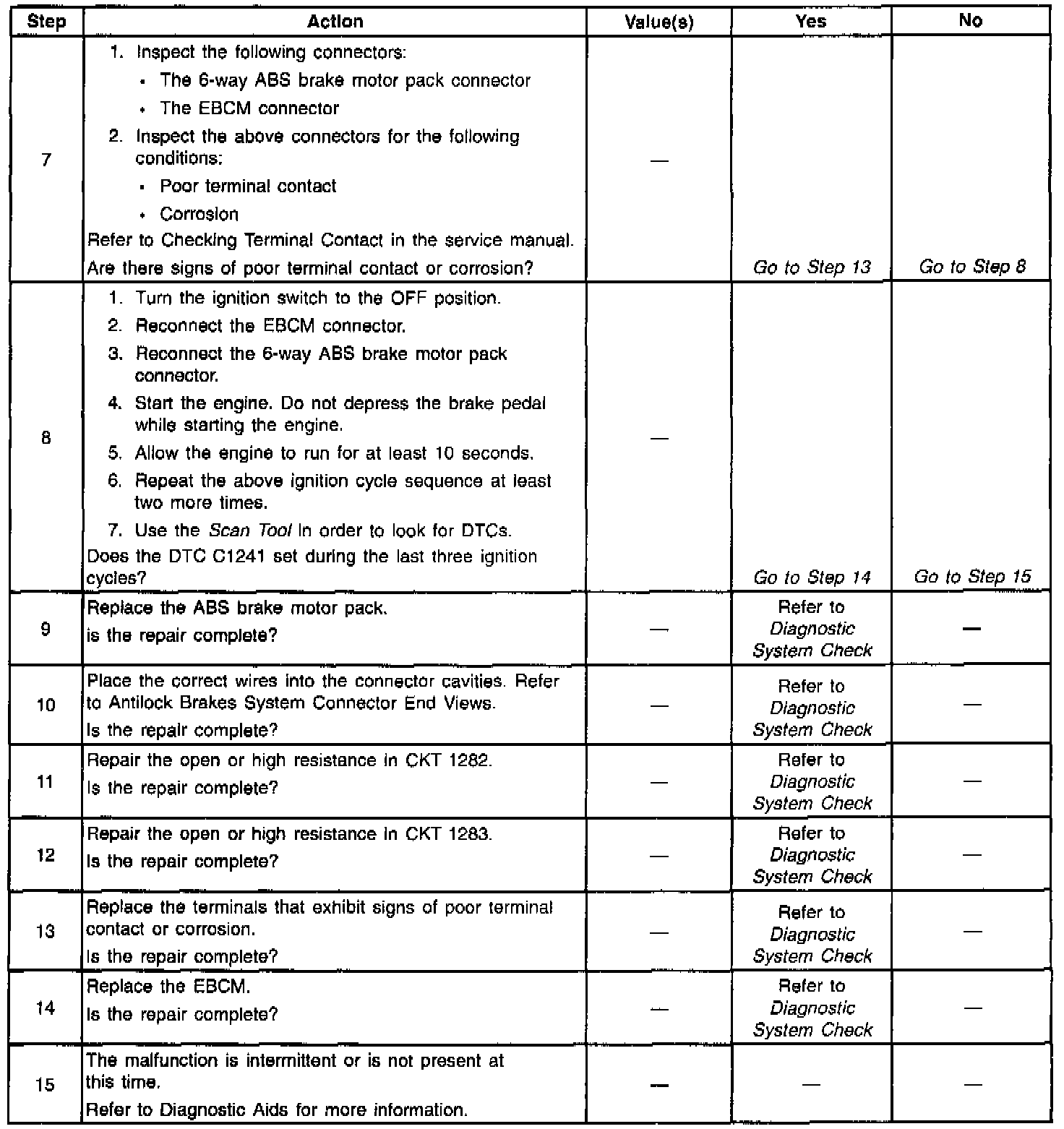DTC C1241 detects a slipping right front Expansion Spring Brake (ESB). During initialization and braking, the right front brake motor is rehomed. If the ESB slips, the motor/piston will move. During the next key to RUN initialization, a rehome of the motor verifies the motor/piston remained at the home position. If motor movement is detected, the ESB must be slipping.