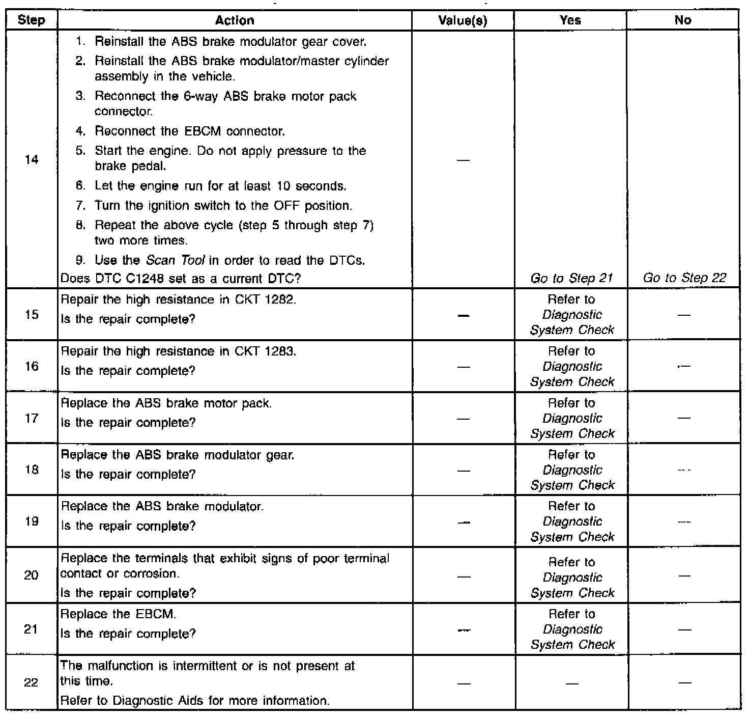 DTC C1248 detects a stripped nut or gear assembly during initialization. During the homing sequence, the piston should reach the top of the bore. Then the ABS motor stalls. If the ABS motor does not stall, the ABS motor must be spinning with little or no resistance. This indicates a nut/screw or gear malfunction.