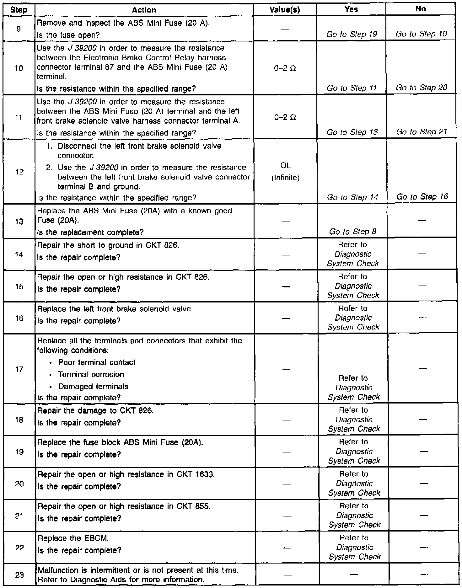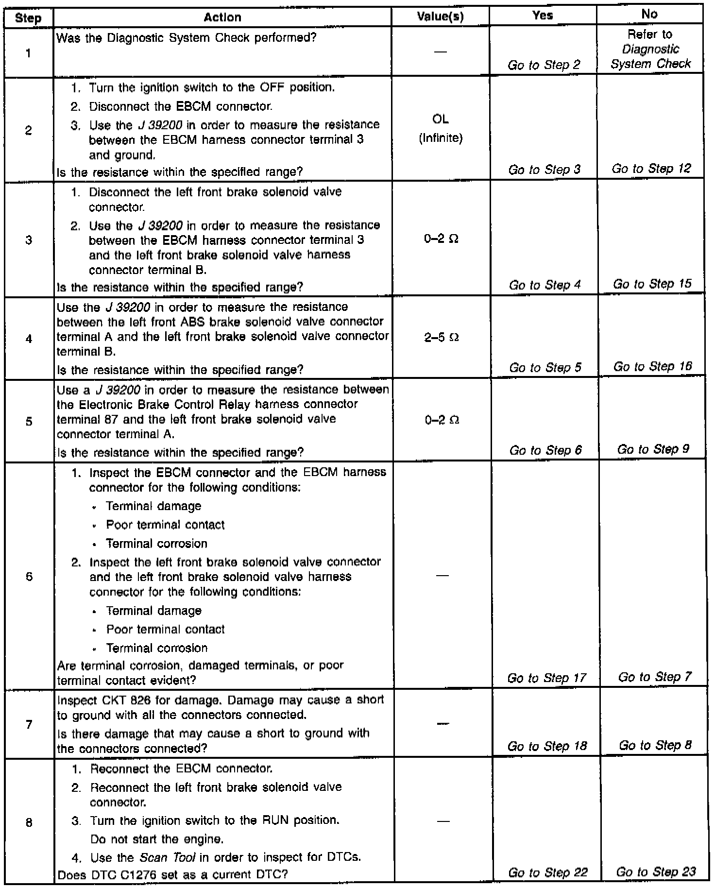 A malfunction exists if the EBCM detects the left front brake solenoid valve control circuit voltage is not within specifications.
