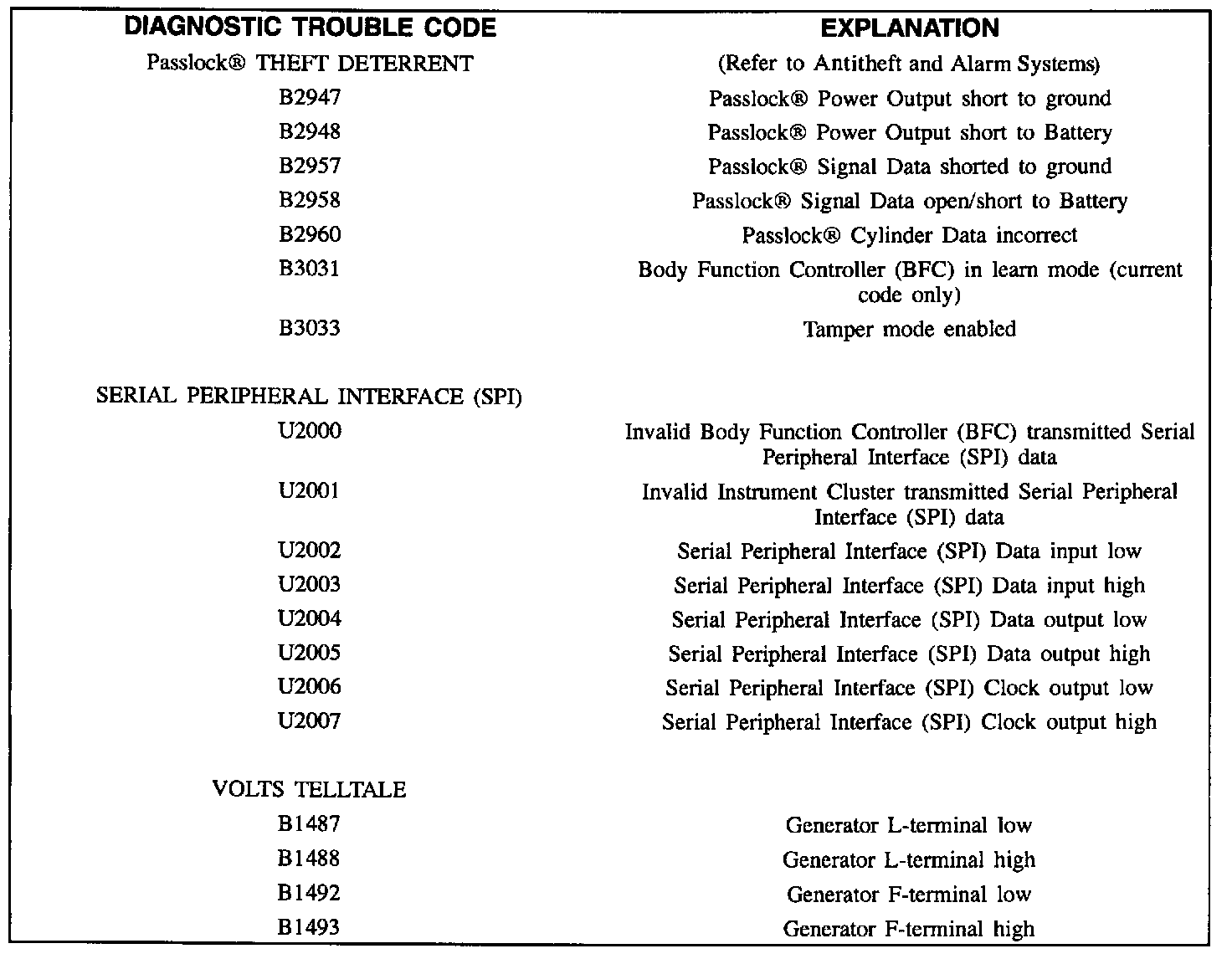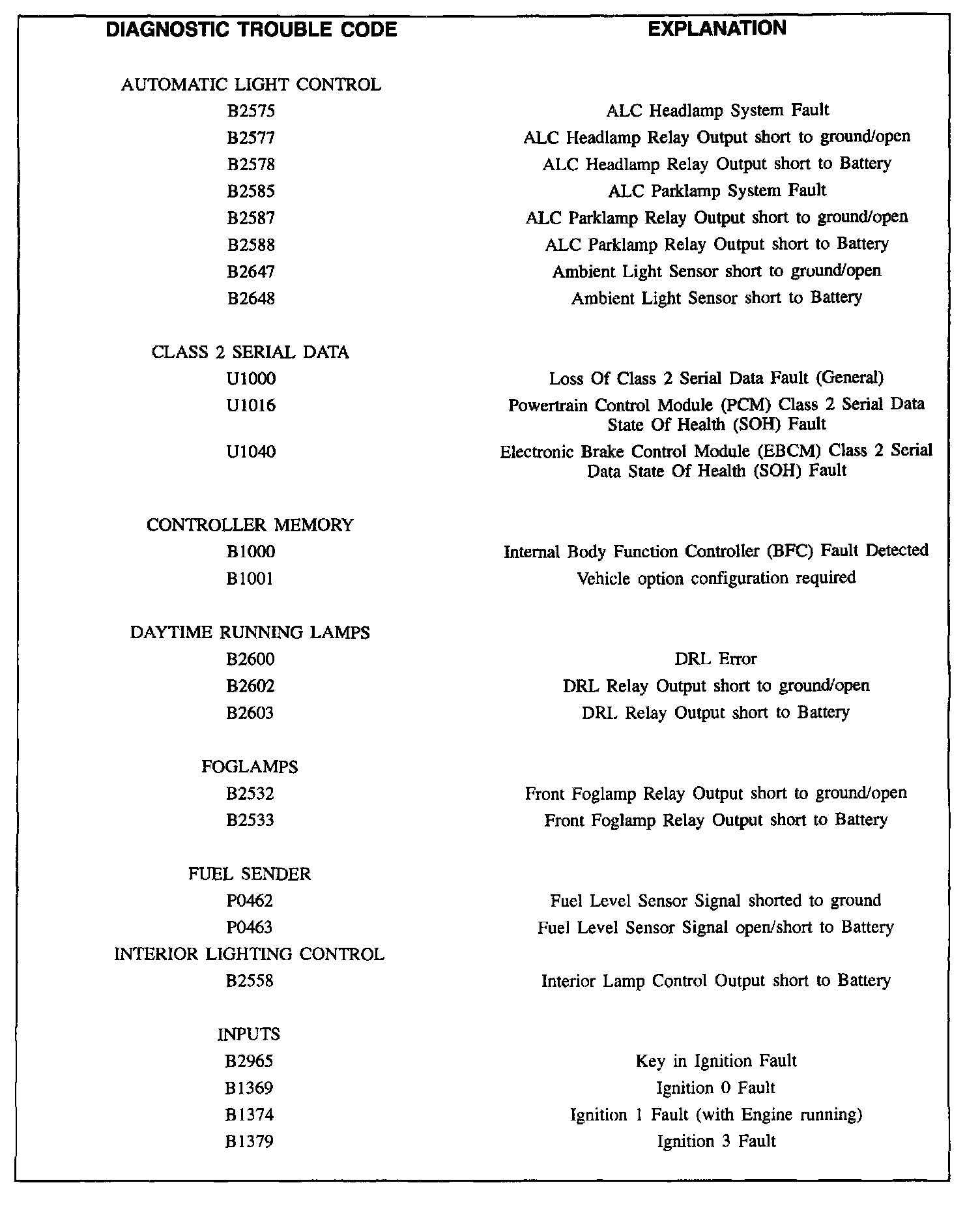 The BFC is connected to the Class 2 serial data link and is capable of setting Diagnostic Trouble Codes. The history DTC codes (a history DTC code is a fault that disappears in the next ignition cycle) can be especially useful in diagnosing an intermittent problem. An explanation of these are given in DTC Table.
