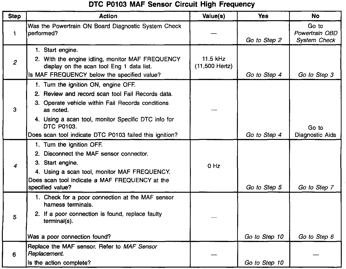 The MAF sensor produces a frequency signal which can be monitored using a scan tool. The frequency will vary within a range of around 2000 Hertz at idle to near 10,000 Hertz at maximum engine load. DTC P0103 will be set if the signal from the MAF sensor is above the possible range of a normally operating MAF sensor.