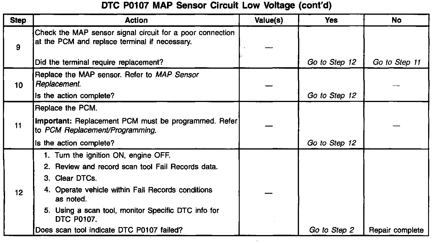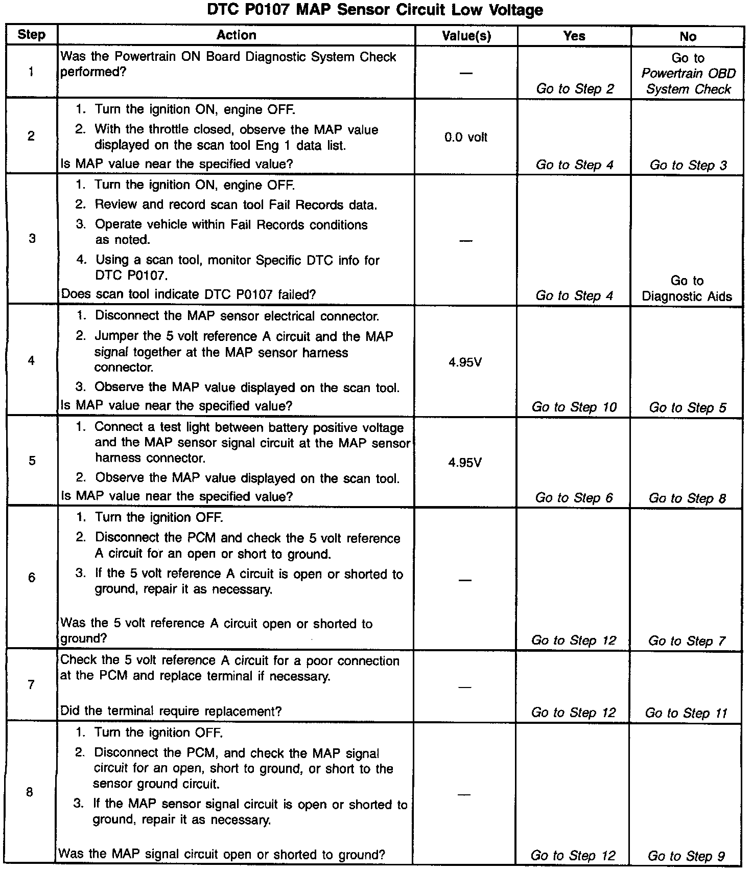 The MAP sensor is used to determine manifold pressure changes while the EGR flow test diagnostic is being run (refer to DTC P0401), to determine engine vacuum level for some other diagnostics and to determine barometric pressure (BARO). The PCM monitors the MAP signals for voltages outside the normal range of the MAP sensor. If the PCM detects a MAP signal voltage that is excessively low, DTC P0107 will be set.