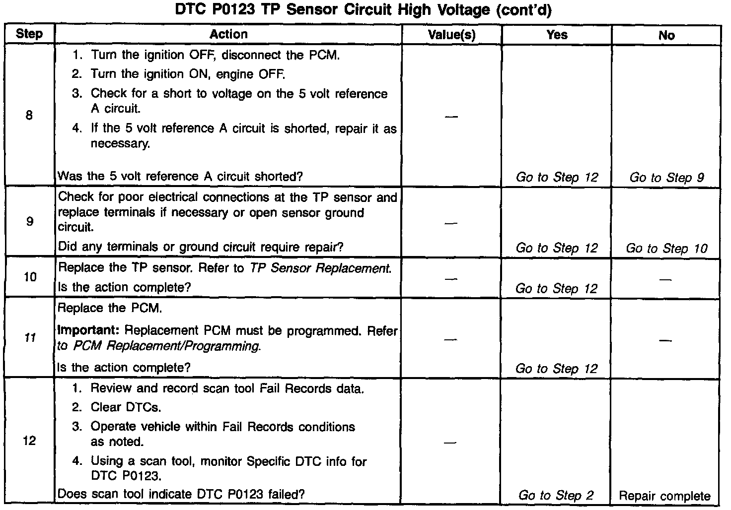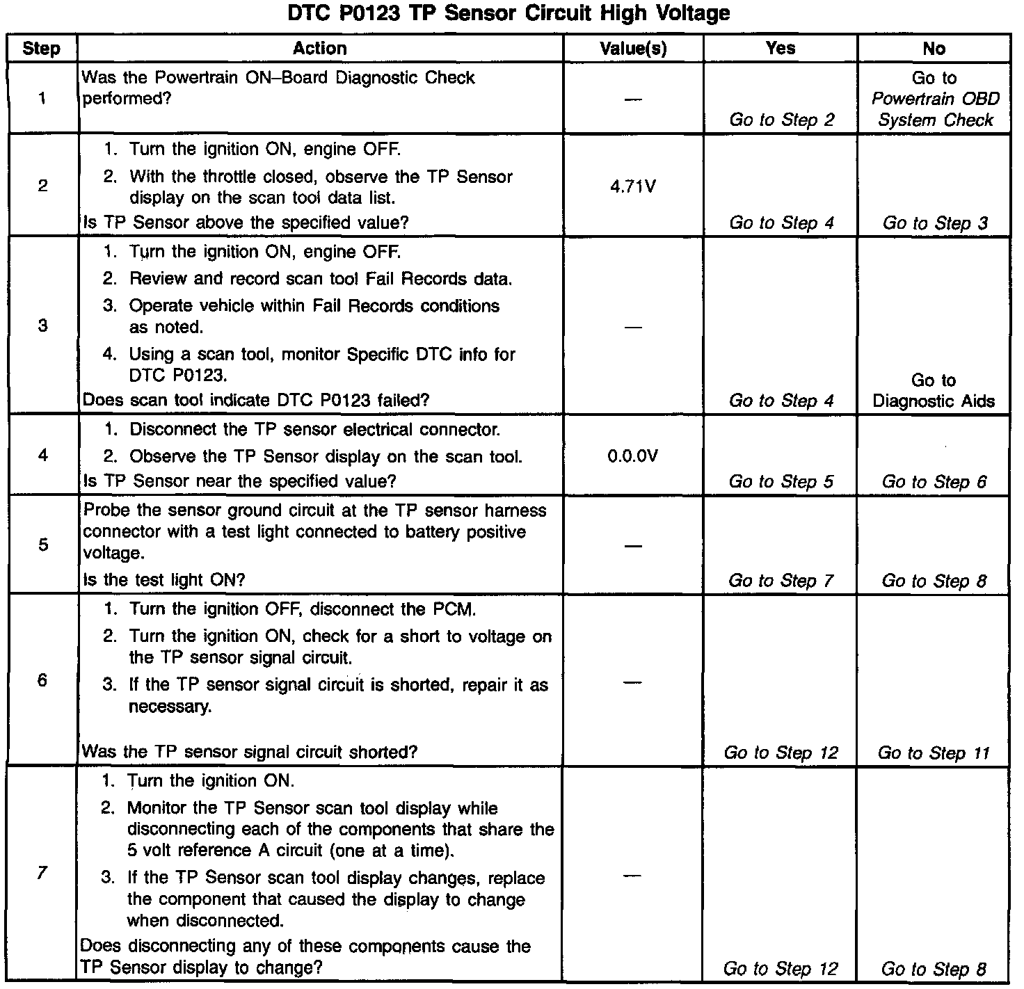 If DTC P0123 cannot be duplicated, the information included in the Fail Records data can be useful in determining vehicle mileage since the DTC was last set. If it is determined that the DTC occurs intermittently, performing the DTC P1121 Diagnostic Chart may isolate the cause of the fault.