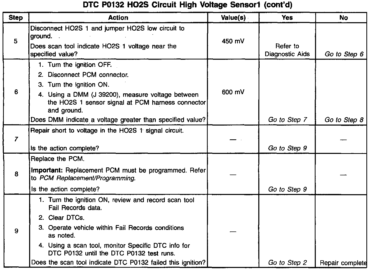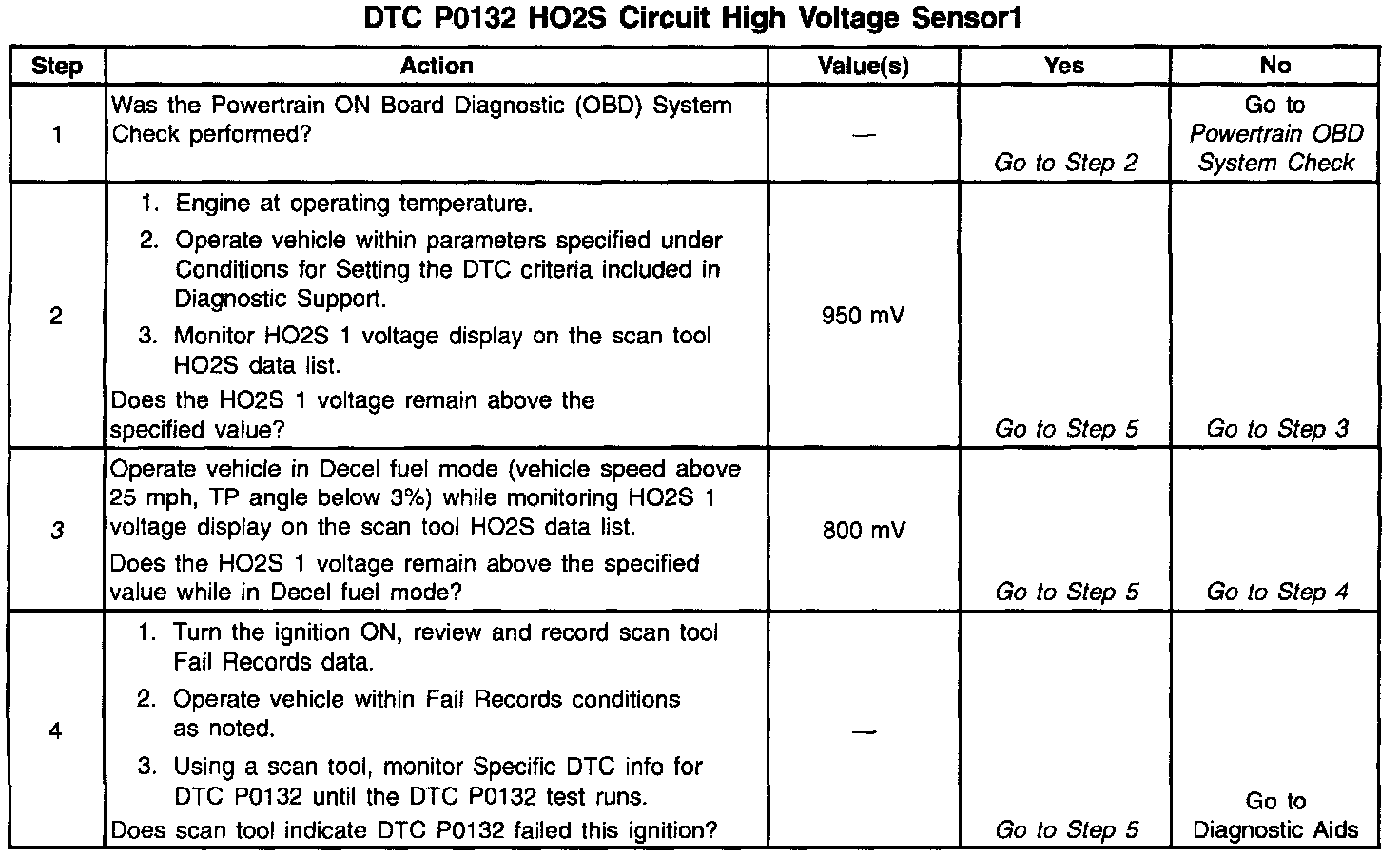 3. DTC P0132 failing during deceleration fuel mode operation may indicate a condition described in the Diagnostic Aids above. If the DTC P0132 test passes while the Fail Records conditions are being duplicated, an intermittent condition is indicated. Reviewing the Fail Records vehicle mileage since the diagnostic test last failed may help determine how often the condition that caused the DTC to be set occurs. This may assist in diagnosing the condition.