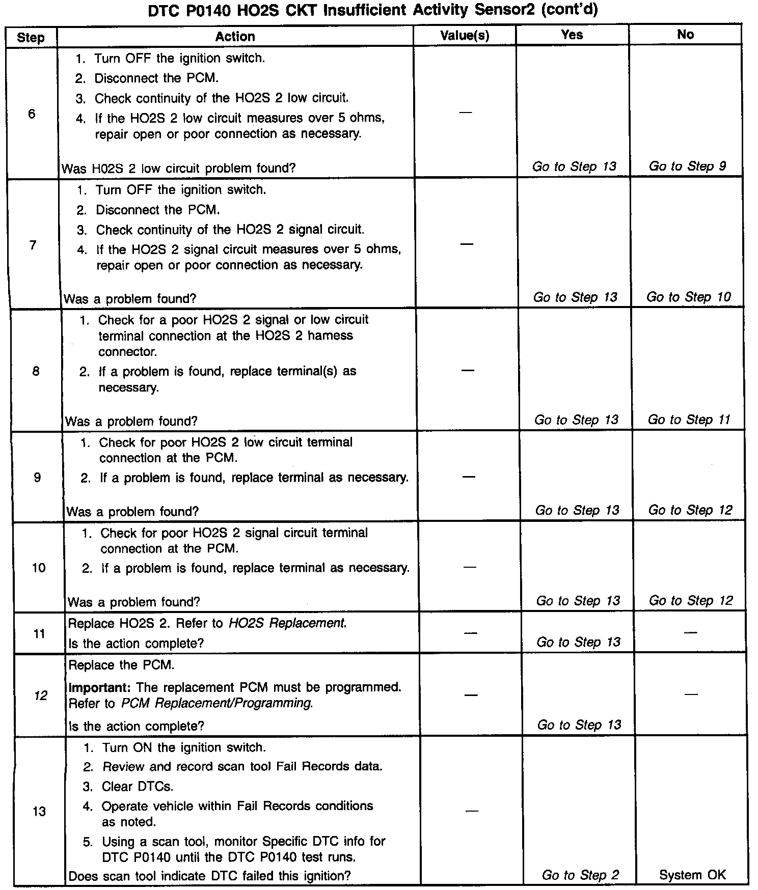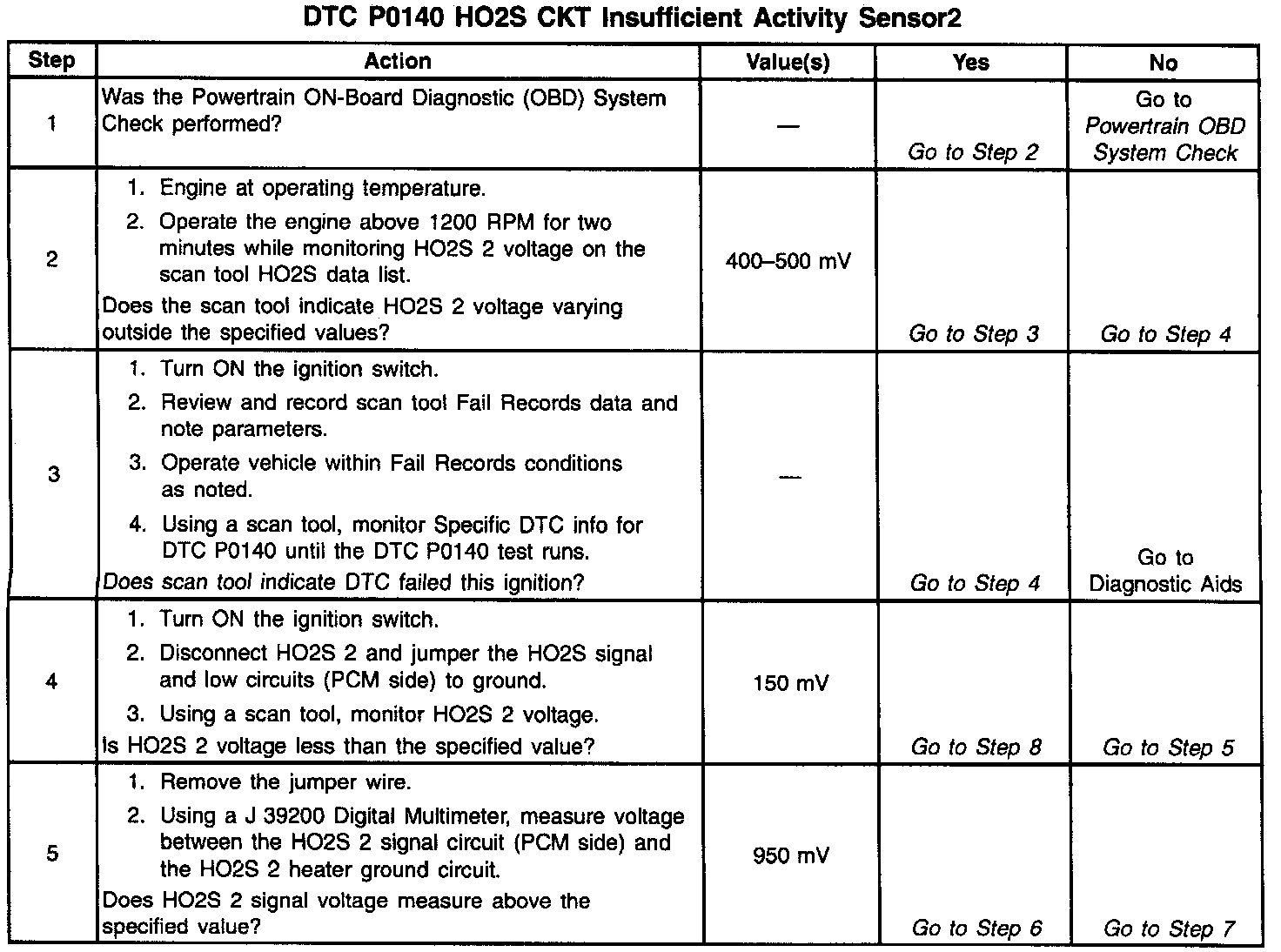 To control emissions of Hydrocarbons (HC), Carbon Monoxide (CO), and Oxides of Nitrogen (NOx), a three way catalytic converter is used. The catalyst within the converter promotes a chemical reaction which oxidizes the HC and CO present in the exhaust gas, converting them into harmless water vapor and carbon dioxide. The catalyst also reduces NOx, converting it to nitrogen. The PCM has the ability to monitor this process using the HO2S 1 and the HO2S 2 heated oxygen sensors. The HO2S 1 sensor produces an output signal which indicates the amount of oxygen present in the exhaust gas entering the three way catalytic converter. The HO2S 2 sensor produces an output signal which indicates the oxygen storage capacity of the catalyst this in turn indicates the catalysts ability to convert exhaust gases efficiently. If the catalyst is operating efficiently, the HO2S 1 signal will be far more active than that produced by the HO2S 2 sensor. If the HO2S 2 signal voltage remains at or near the 450 mV bias for an extended period of time, DTC P0140 will be set.