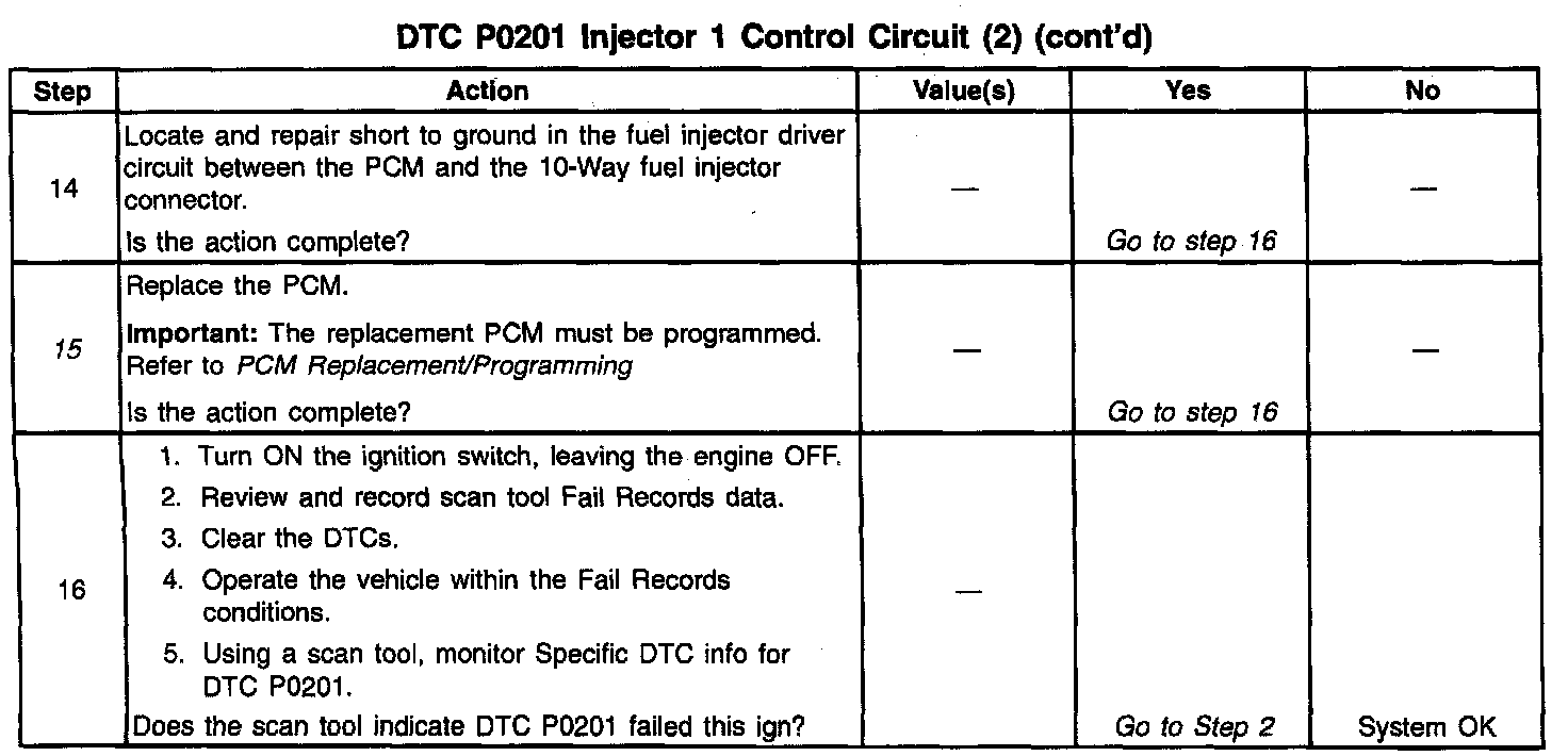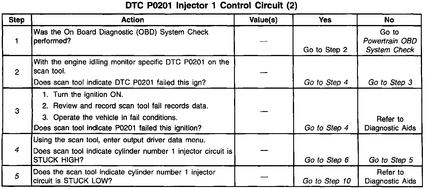 The PCM controls the fuel injector control circuit using a Multi Function Driver (MFD). The MFD has the ability to detect an electrical malfunction. If an electrical malfunction is detected, the MFD signals the PCM to set DTC P0201.