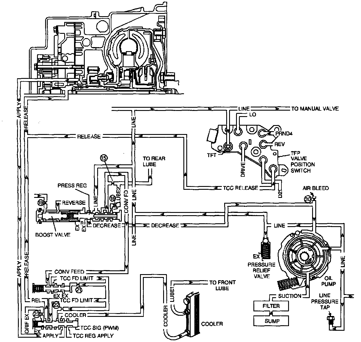 The transmission fluid pump is constantly circulating fluid through the torque converter. Hot fluid leaving the converter flows through the transmission cooler lines to the oil cooler, located in the vehicle radiator. From the cooler, the fluid returns to the transmission.
