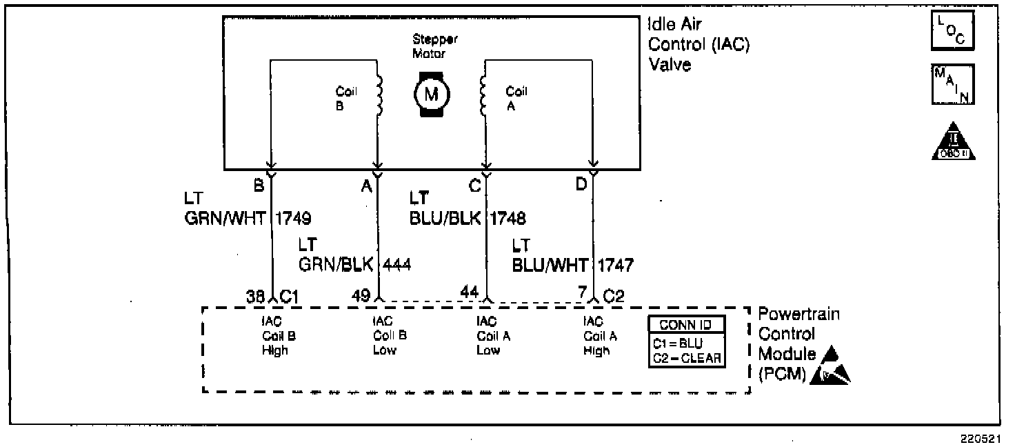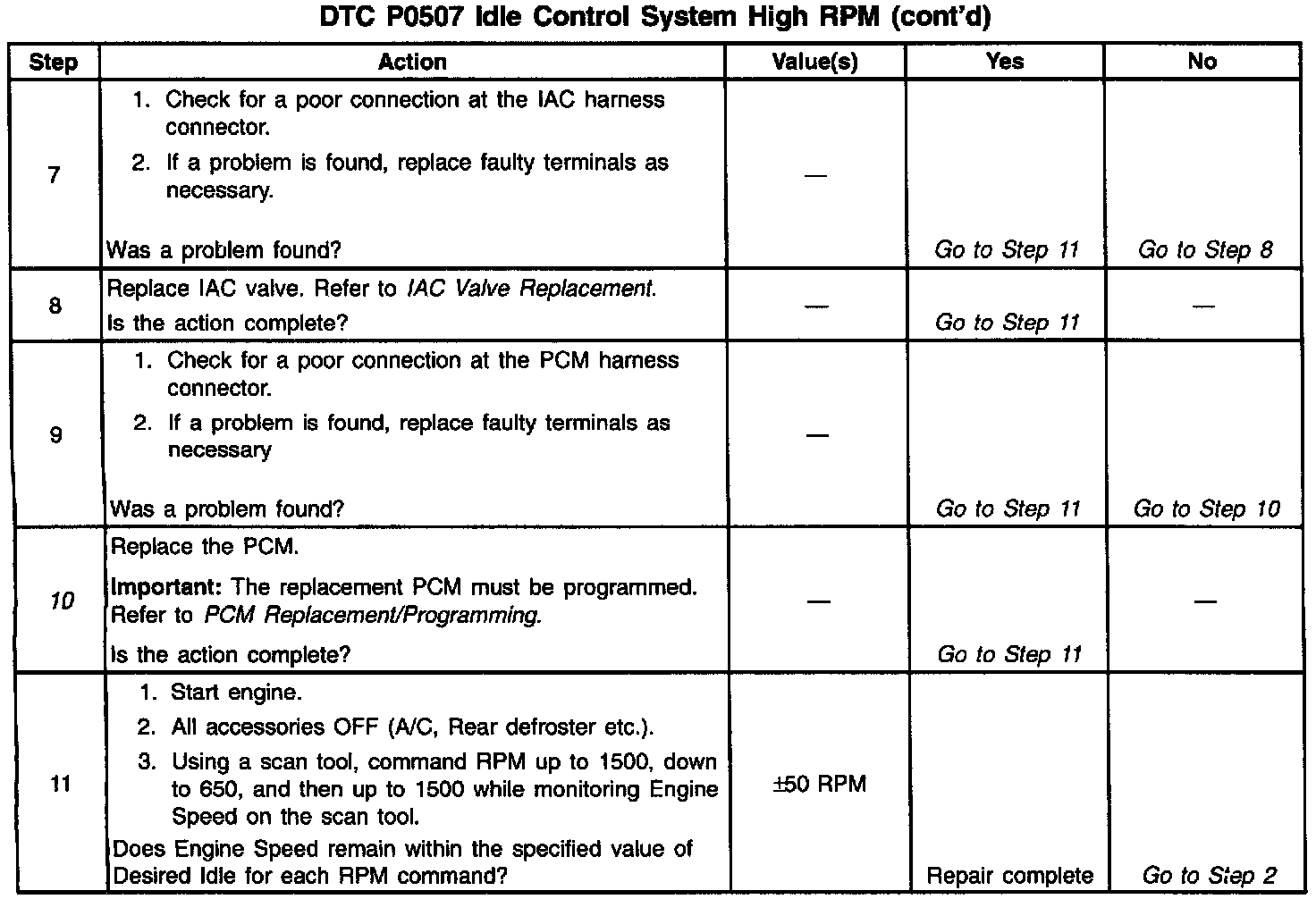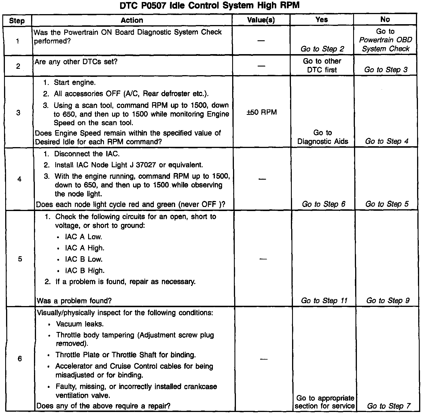 The PCM controls engine idle speed by adjusting the position of the Idle Air Control (IAC) motor pintle. The IAC is a bi-directional motor driven by two coils. The PCM applies current to the IAC coils in steps (counts) to extend the IAC pintle into a passage in the throttle body to decrease air flow. The PCM reverses the current to retract the pintle, increasing air flow. This method allows highly accurate control of idle speed and quick response to changes in engine load. If the PCM detects a condition where too high of an idle speed is present and the PCM is unable to adjust idle speed by decreasing the IAC counts, DTC P0507 will set indicating a problem with the idle control system.
