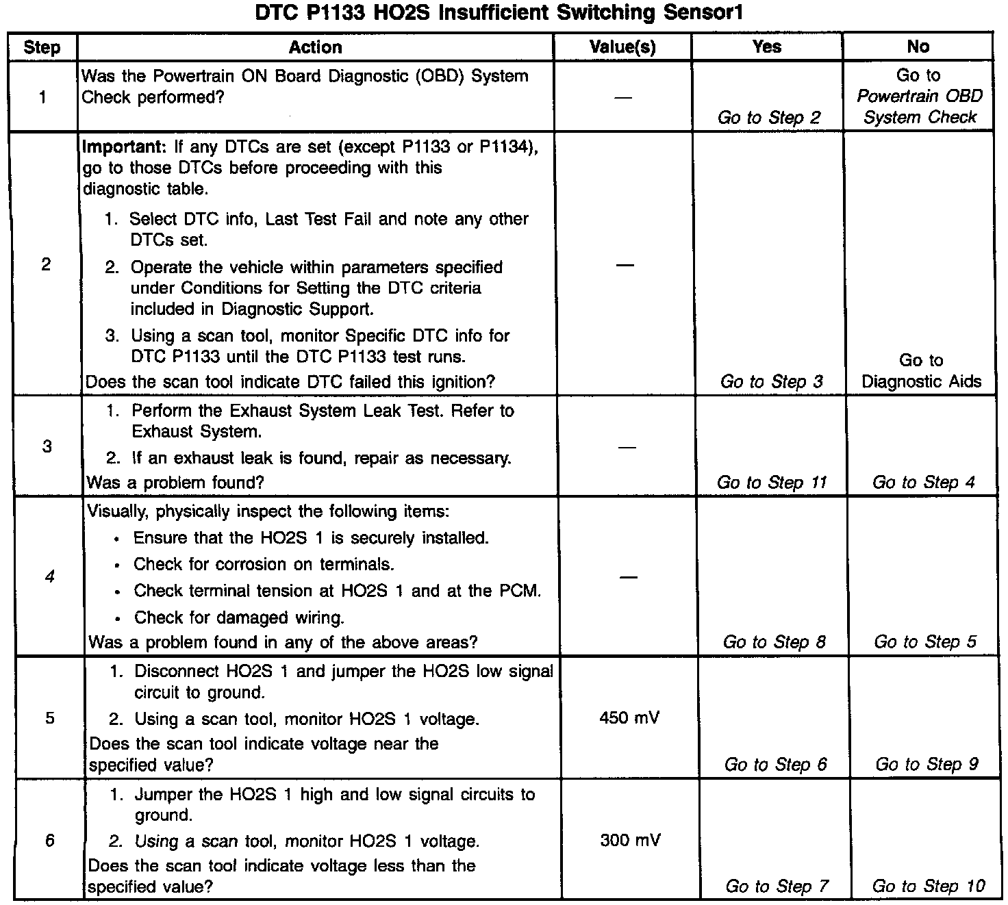 The PCM monitors the Heated Oxygen Sensor (HO2S) activity for 100 seconds. During this test period the PCM counts the number of times that the HO2S signal voltage crosses the rich to lean and lean to rich thresholds. If the PCM determines that the HO2S did not switch enough times, DTC P1133 will be set.