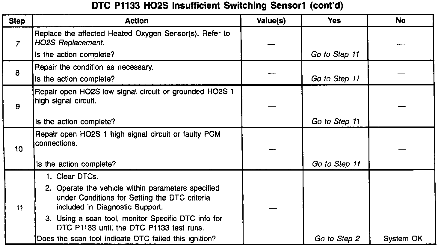 A malfunction in the HO2S heater ignition feed or ground circuit may cause a DTC P1133 to set. Check HO2S heater circuitry for intermittent faults or poor connections. If connections and wiring are OK and DTC P1133 continues to set, replace the HO2S 1.