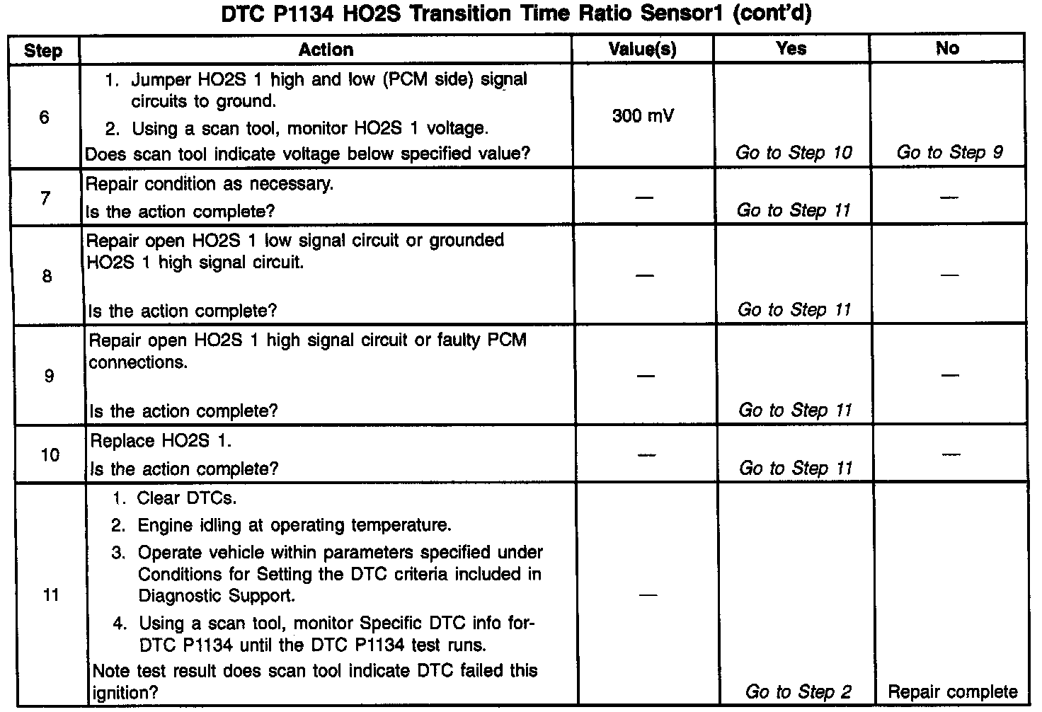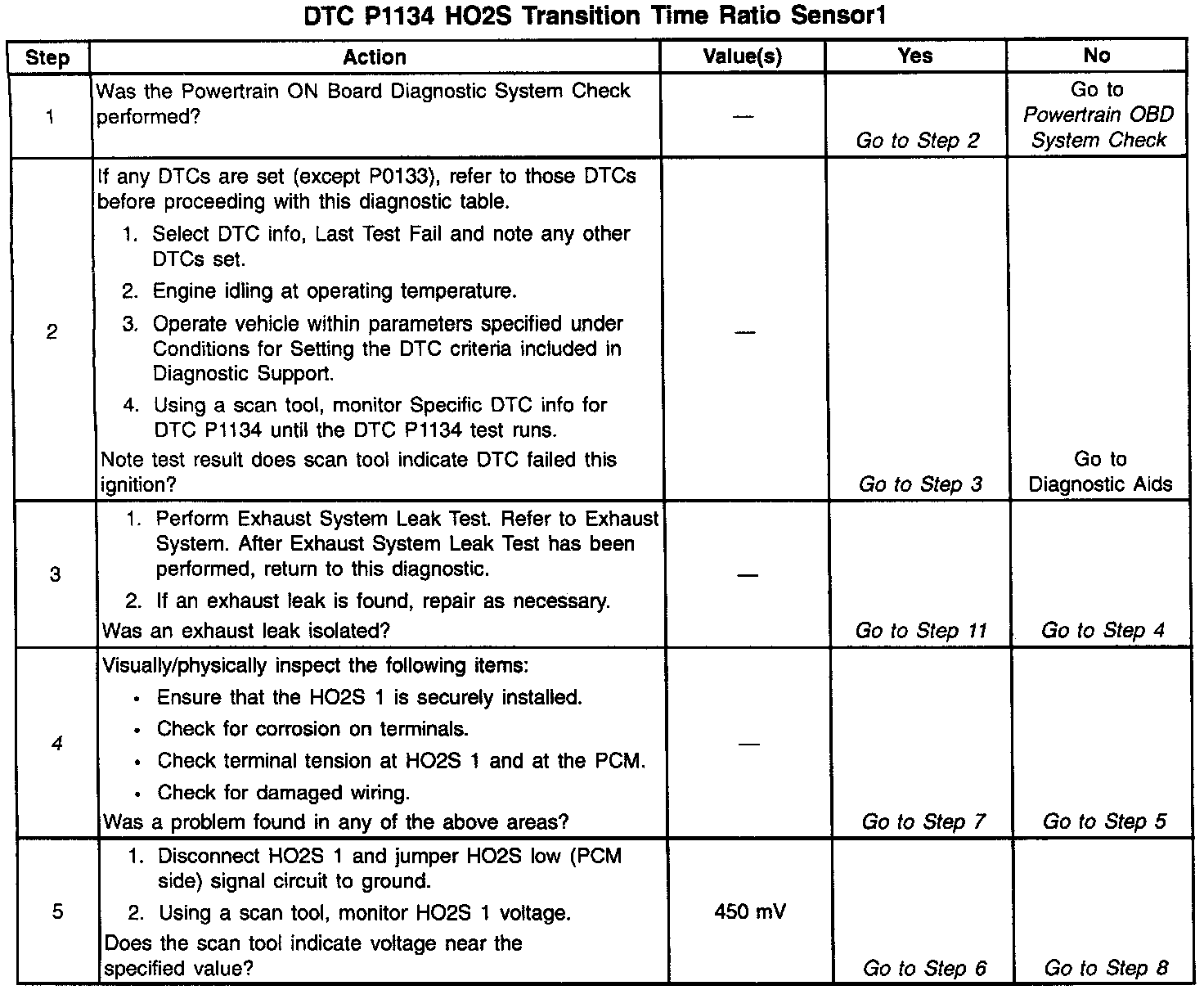 The PCM continuously monitors the Heated Oxygen Sensor (HO2S) activity for 100 seconds. During the monitor period the PCM counts the number of times that the HO2S responds from rich to lean and from lean to rich and adds the amount of time it took to complete all transitions. With this information, an average time for all transitions can be determined. The PCM then divides the rich to lean average by the lean to rich average to obtain a ratio. If the HO2S transition time ratio is not within range, DTC P1134 will be set, indicating that the oxygen sensor is not responding as expected to changes in exhaust oxygen content