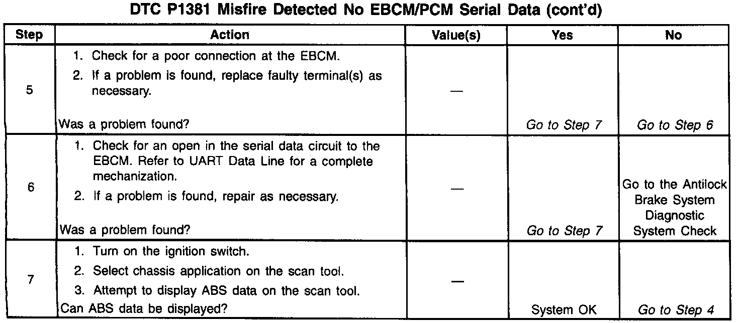 The PCM receives rough road information from the EBCM / EBTCM on the Class II serial data circuit. The PCM uses the rough road information to enhance the misfire diagnostic by distinguishing crankshaft speed variations caused by driving on rough road surfaces from variations caused by true misfires. The EBCM / EBTCM transmits rough road information based on inputs from the wheel speed sensors. If a loss of communication occurs which causes the PCM not to receive rough road information while DTC P0300 is requesting the Malfunction Indicator Lamp (MIL), DTC P1381 will set.