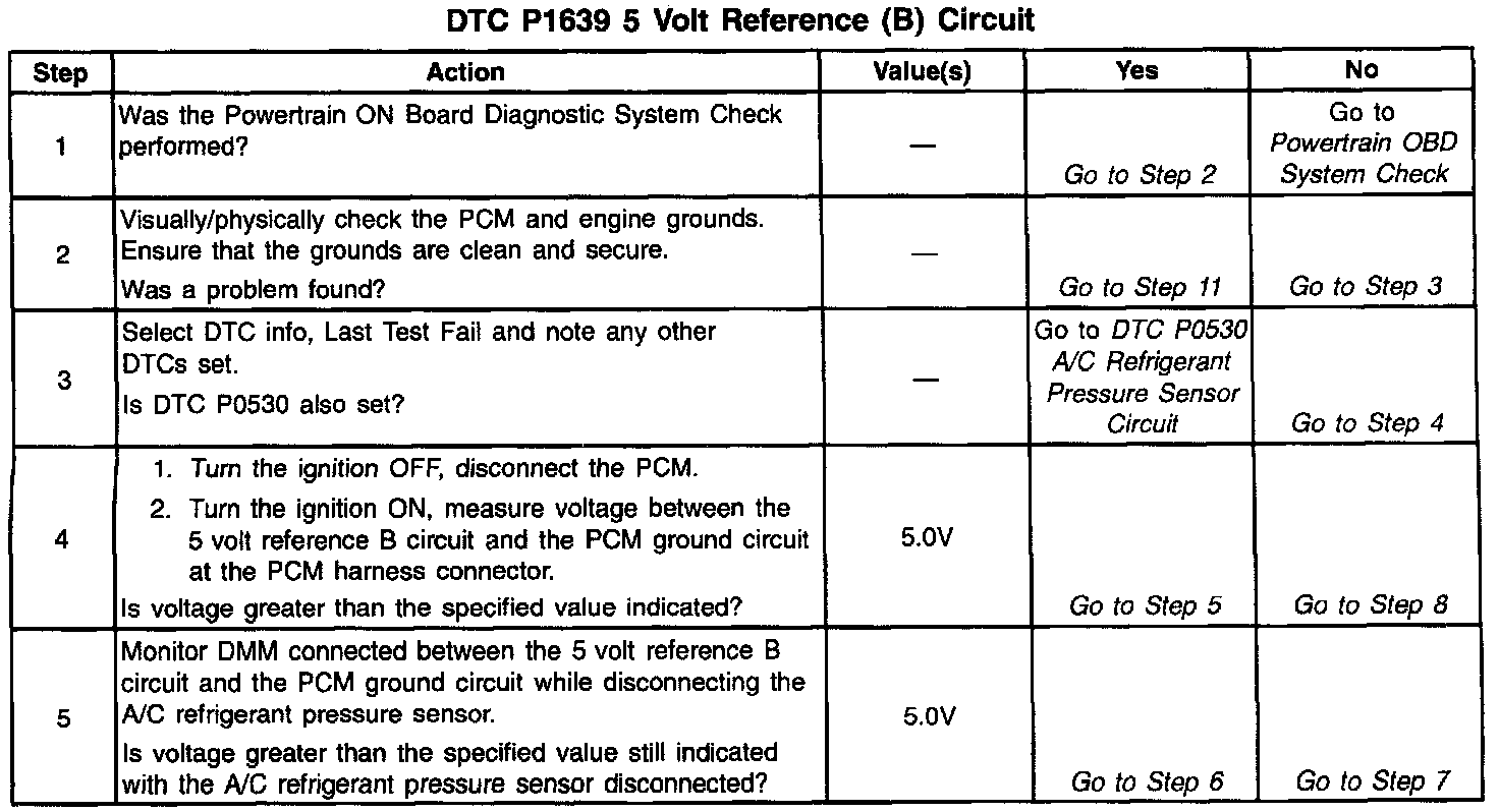 The PCM uses the 5 Volt Reference B circuit as a sensor feed to the A/C Refrigerant Pressure Sensor. The PCM monitors the voltage on the 5 Volt Reference B circuit. If the voltage is out of tolerance, the PCM will set DTC P1639.