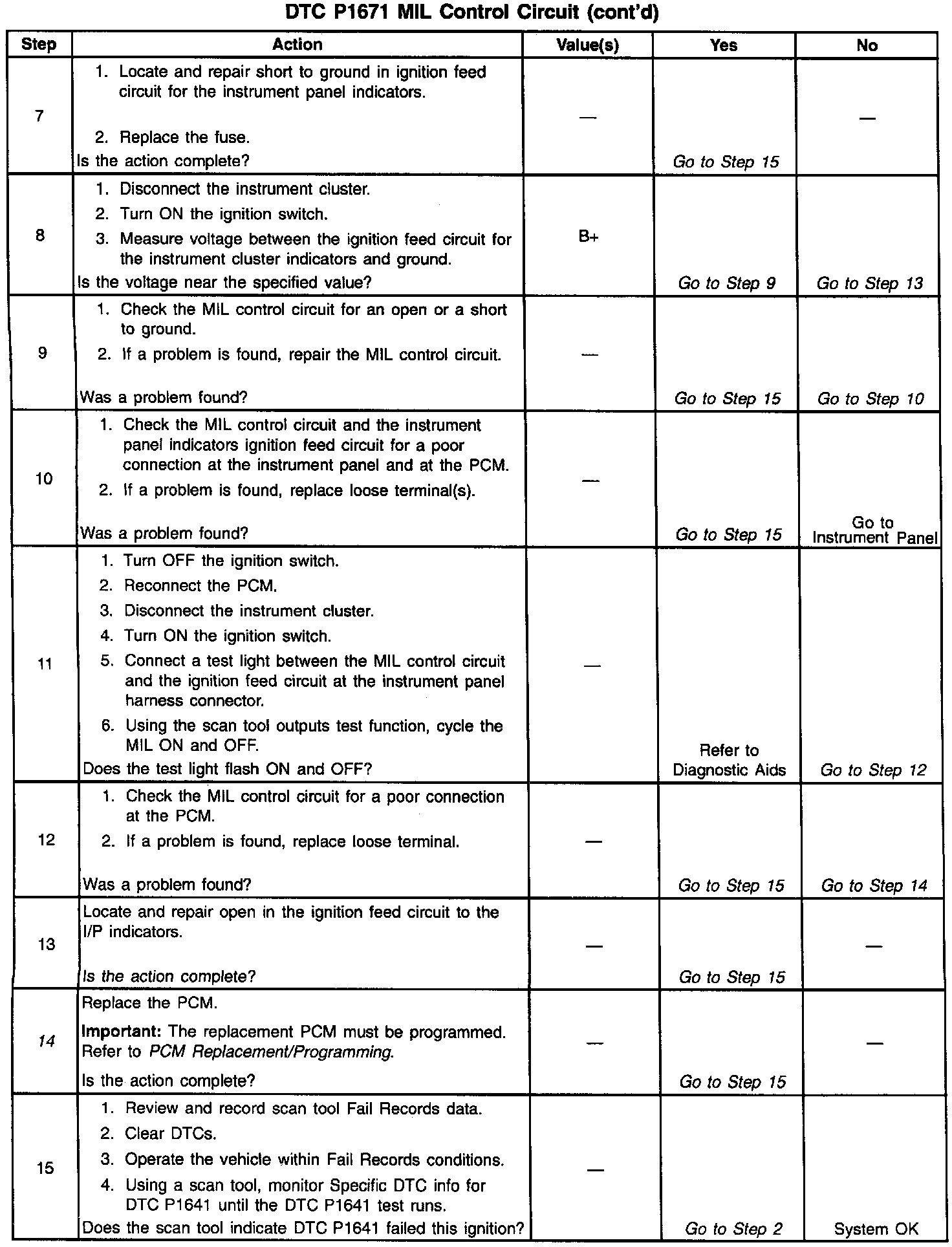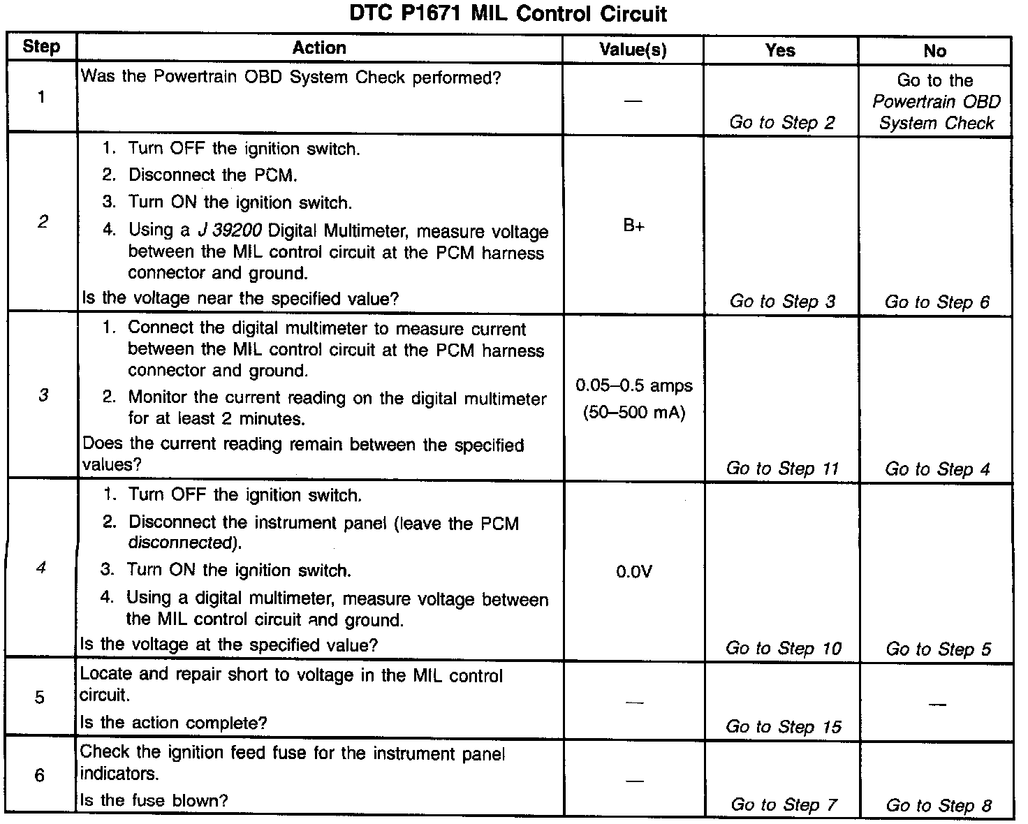 Output Driver Modules (ODMs) are used by the PCM to turn on many of the current-driven devices that are needed to control various engine and Transaxle functions. Each ODM is capable of controlling up to 7 separate outputs by applying ground to the device which the PCM is commanding on. Unlike the Quad Driver Modules (QDMs) used in prior model years, ODMs have the capability of diagnosing each output circuit individually. DTC P1671 set indicates an improper voltage level on the output circuit that controls the Malfunction Indicator Lamp (MIL).