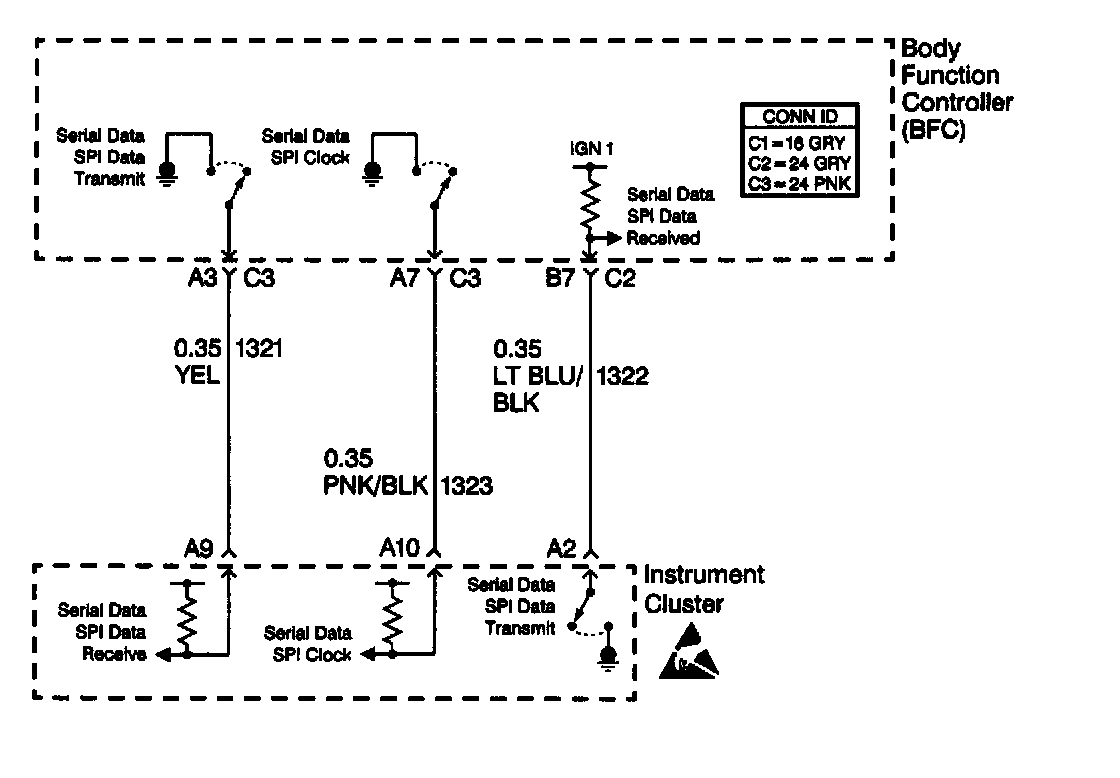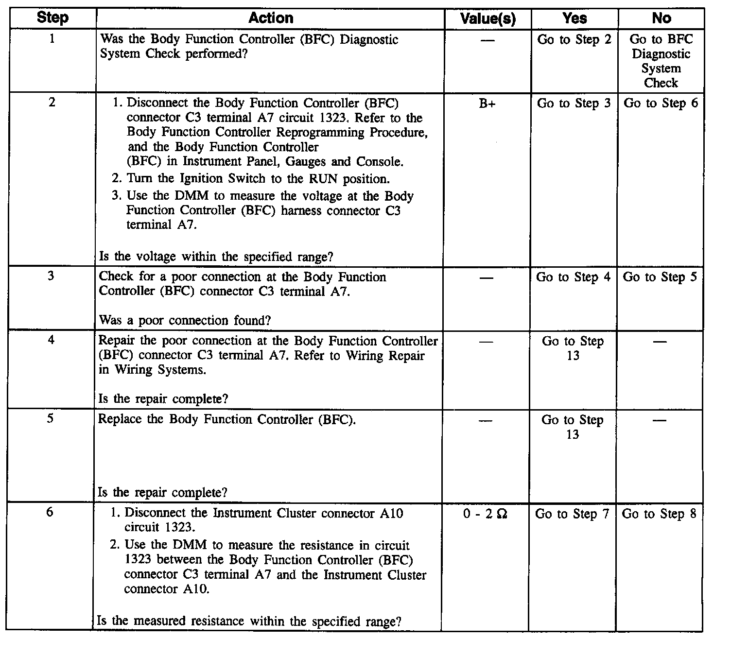 6. This step determines if there is an open in circuit 1323 between the Instrument Cluster and the Body Function Controller (BFC).