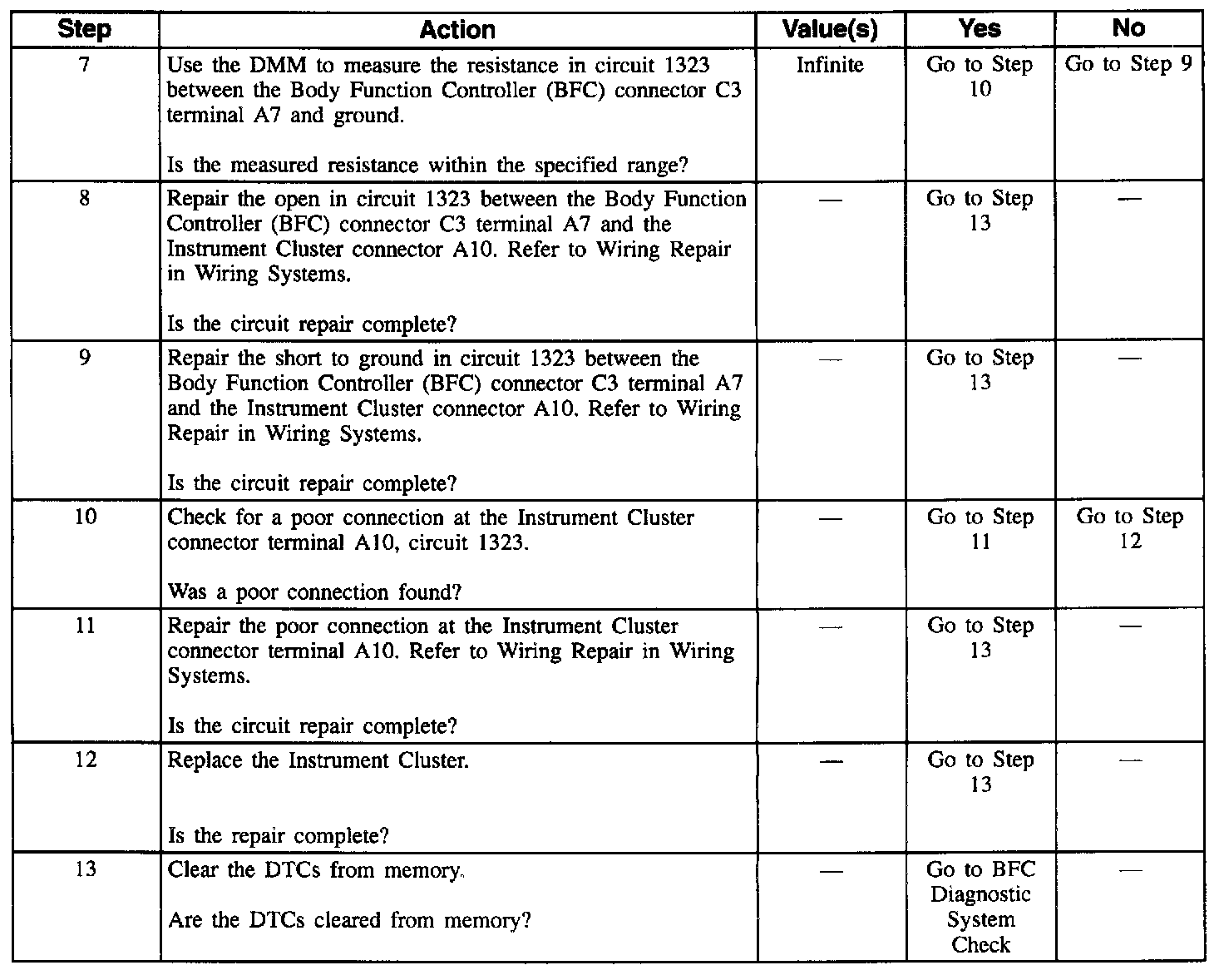7. This step determines if there is a short to ground in circuit 1323 between the Instrument Cluster and the Body Function Controller (BFC).