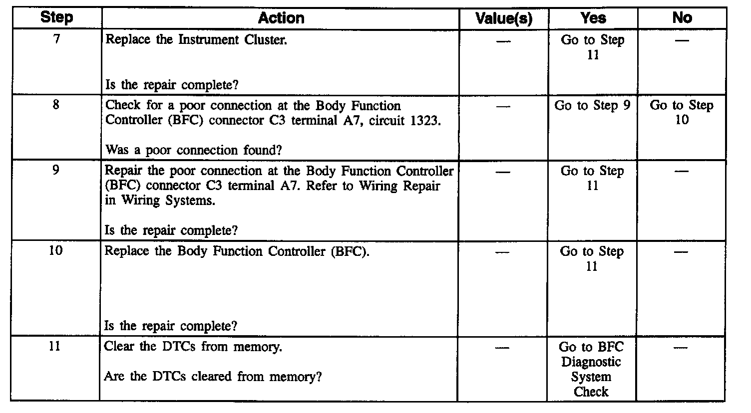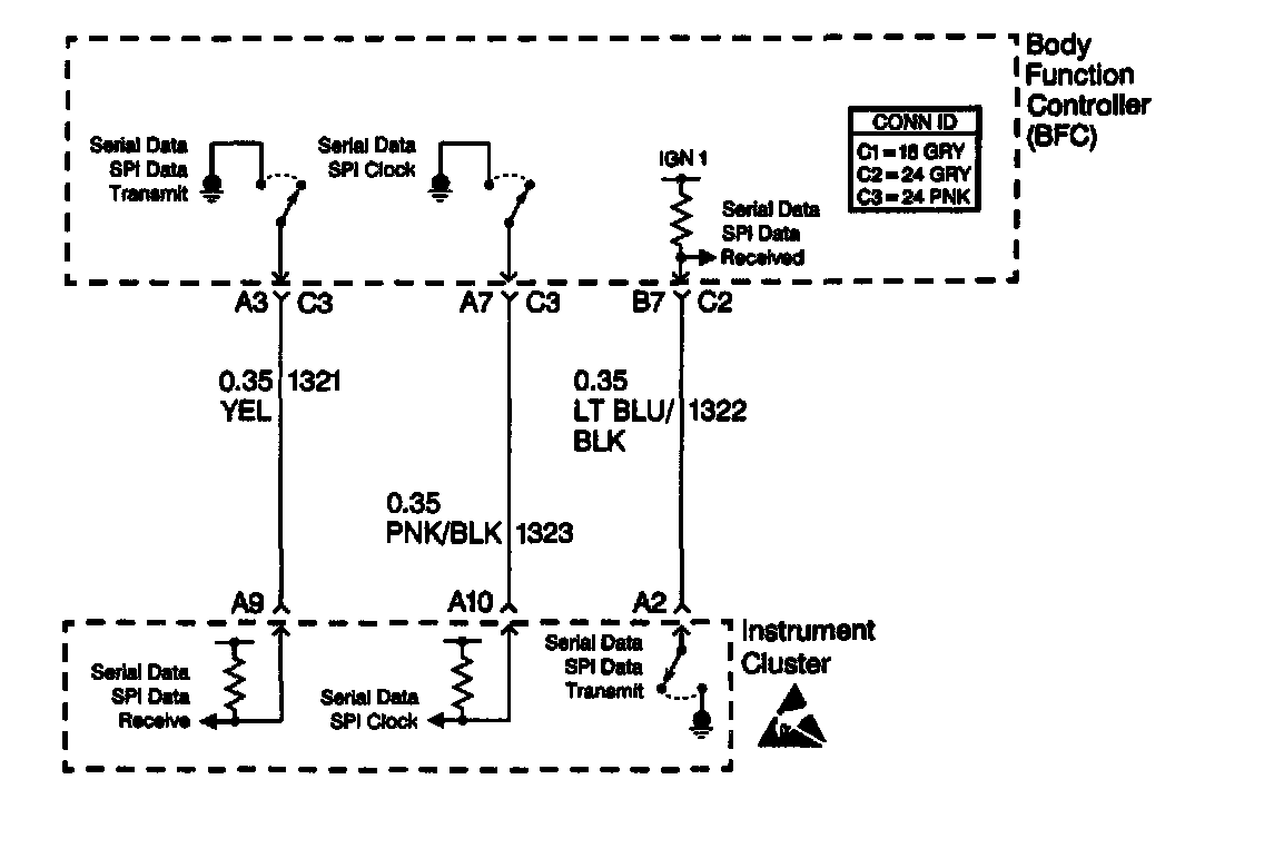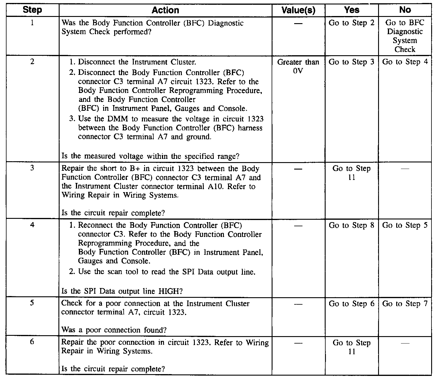 2. This step determines if there is a short to Battery in circuit 1323 between the Instrument Cluster and the Body Function Controller (BFC).