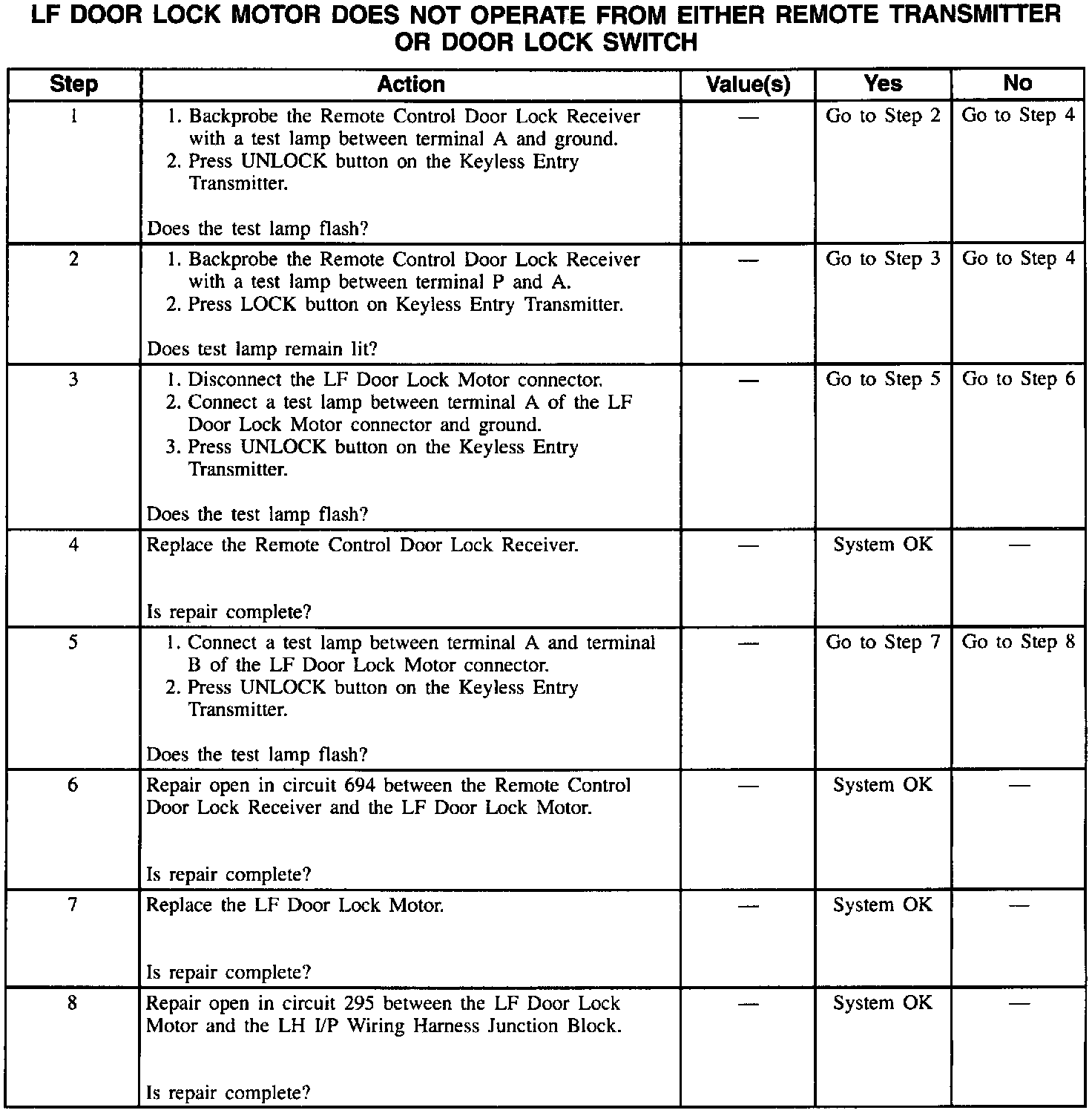 LF Door Lock Motor Does Not Operate From Either Remote Transmitter Or Door Lock Switch: