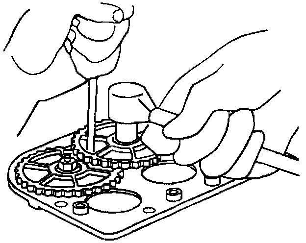 NOTICE: Do not allow gear to turn while removing the retaining nut, since the modulator piston can hit the top of the modulator bore, damaging the piston. Place a screwdriver through the holes in the gears (not between the gears) into the recessed hole in the modulator base. This will prevent the gear from turning, aiding in gear removal.