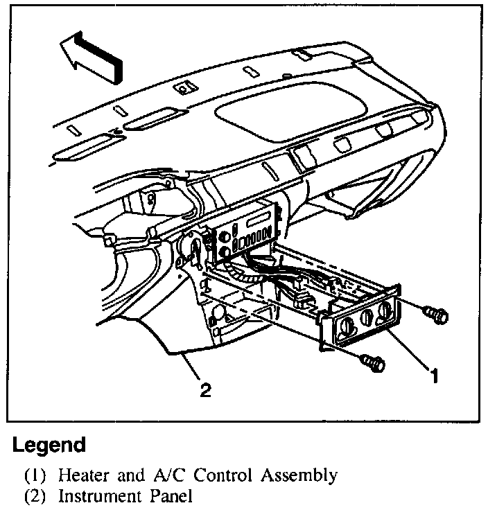 2. Heater and A/C control and retaining screws to instrument panel.