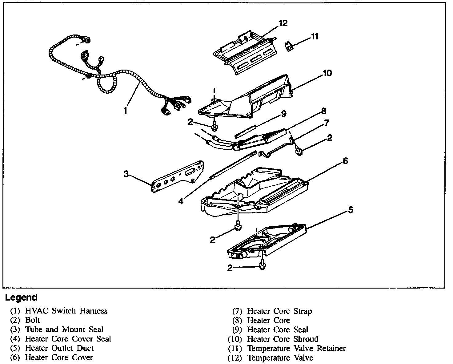 1. Heater core and heater core mounting clamps.