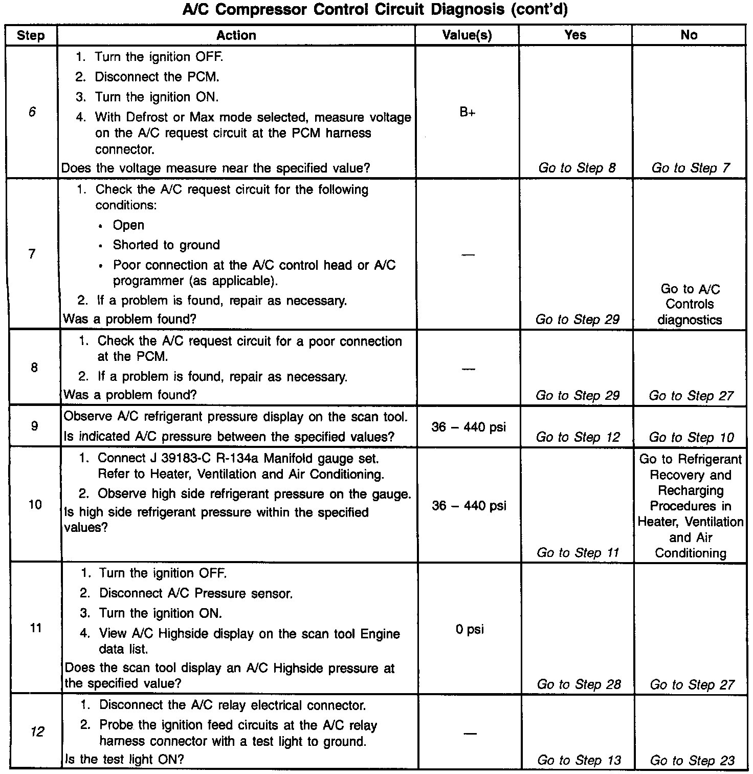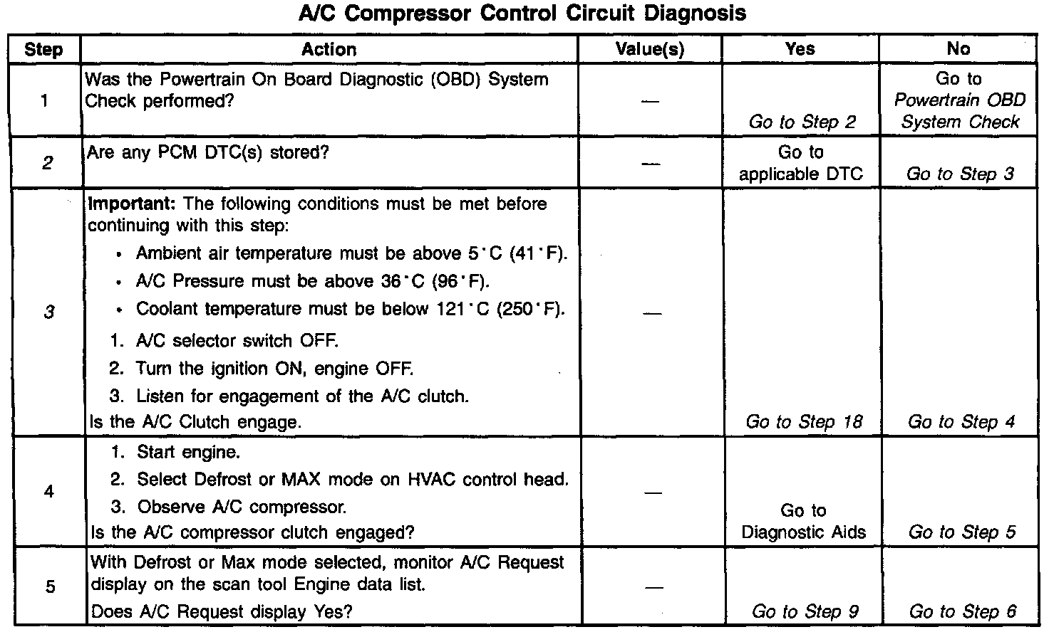 2. Stored Diagnostic Trouble Codes (That may not illuminate the Malfunction indicator Lamp) may disable the A/C compressor. This Diagnostic Table may lead to improper diagnosis and replacement of good parts if Diagnostic Trouble Codes are present.