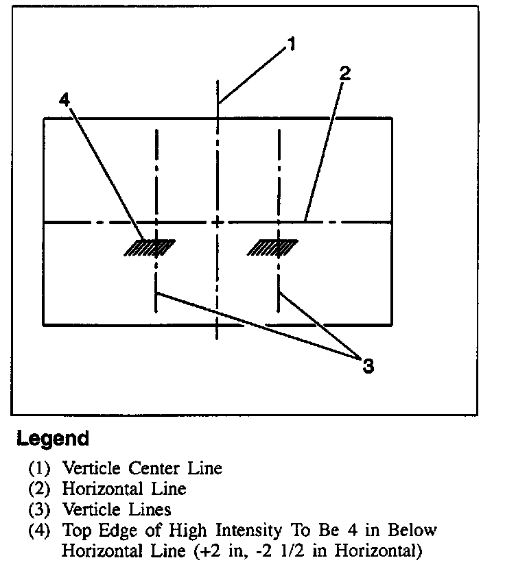 3. The top edge of the high intensity zone shall be 100 mm (4 inch) below the horizontal centerline of the lamps and the center of the high intensity zone shall be on the vertical centerline of the lamps when projected on a screen 7.6 m (25 feet) away.